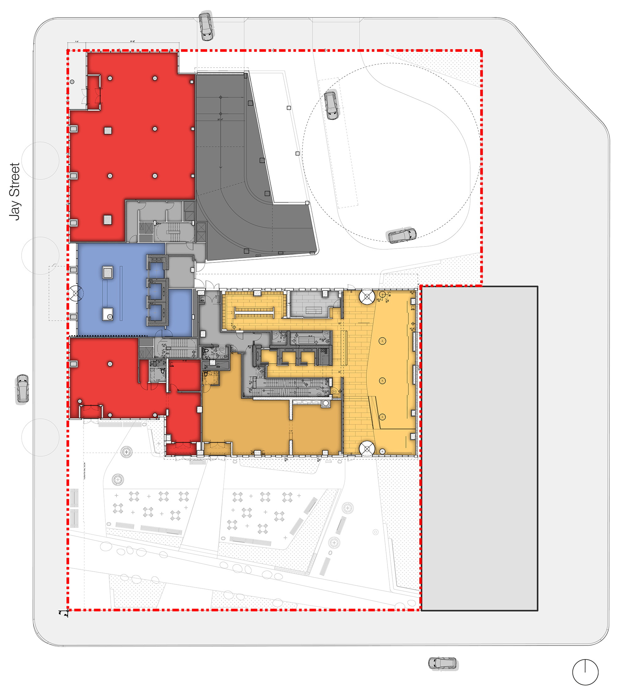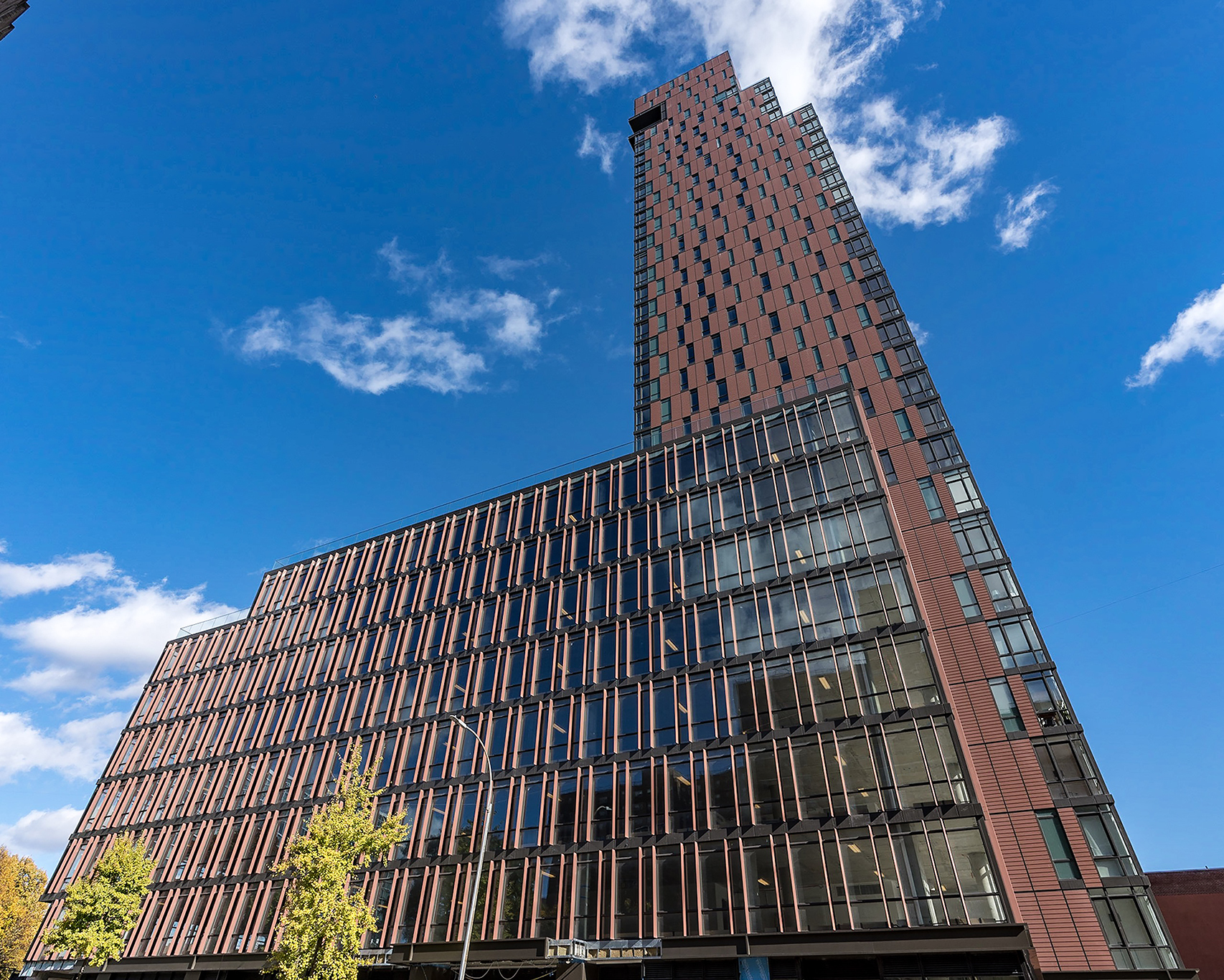 A primary design challenge was how to determine the best way to associate the glass façade of the office building with the residential tower to its east. As a result, an eight-inch metal fin at each mullion was painted to match the terracotta of the residential tower. These fins act as a screen between the residential units and the office interiors but also unite the massing of the office and residential sections through their shared color palette. In addition, the fins add depth to the façade, whose appearance changes as you walk past – textured and solid from an oblique angle but transparent when aligned.