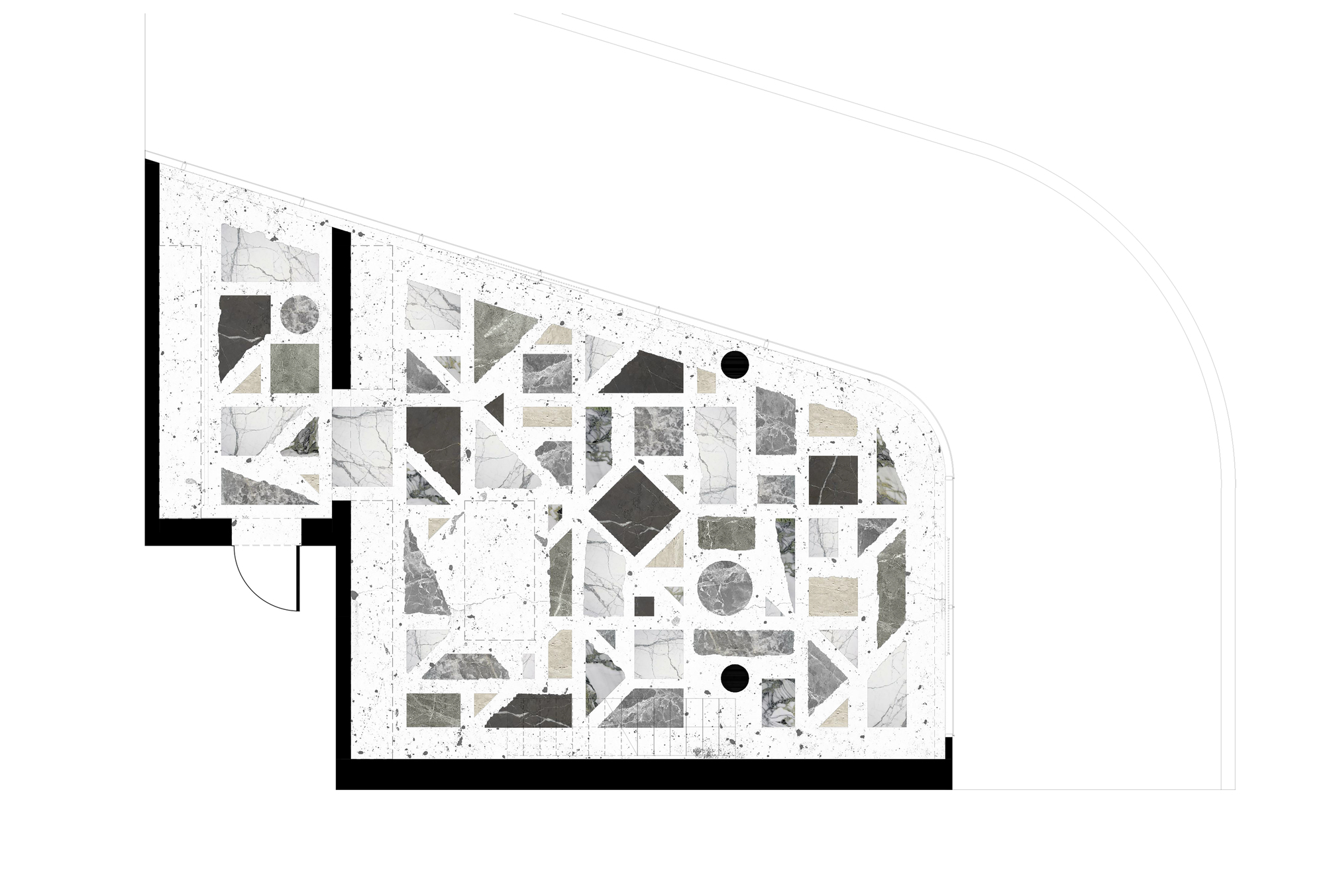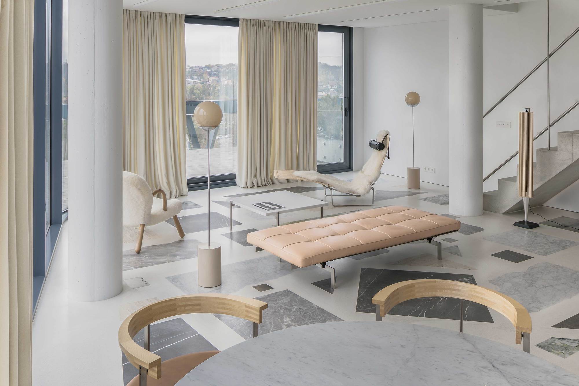 The Apartment, Then sun, rising behind the long panoramic glass facade, playfully slides around the unique terrazzo floor up until very evening. The floor is made by using big scale marble, granite and travertine pieces, combined together with a white concrete binder. Natural stones, each of which has its own precise position to create the unique floor drawing, have different shapes, colours and edges. The floor becomes a background for every thoroughly thought detail in the living room.