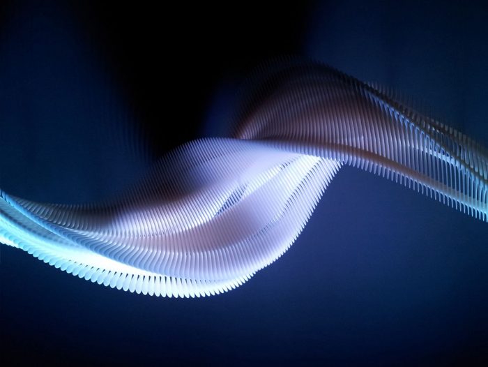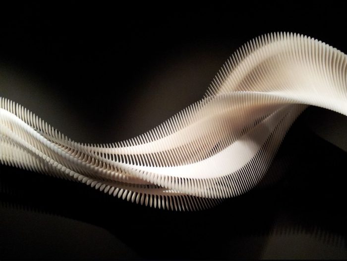 The Art and Science of Flex, by Daniel Widrig captures the essence of motion and crosses the realm of the digital world to land in the reality of a material sculpture. Animation software allows the artist to create multiple snapshots of an abstract geometric figure moving in a 3D space. While the figure accelerates, it gradually reconfigures and expands. After a phase of deceleration, it ultimately halts. From design to the physical form, the snapshot materializes into a four-meter-long intricate sculpture that reinterprets movement and flexibility in unexpected ways.