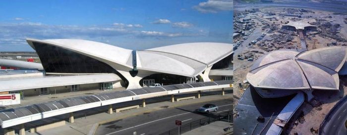 Eero Saarinen’s TWA Flight Centre at JFK International Airport (left) and the Centre’s aerial view (right)