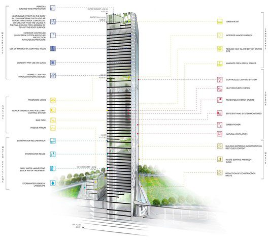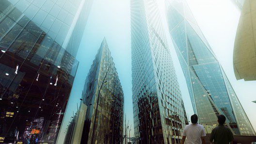 Within the effervescence of the emerging architectural styles, The Blade contrasts by being rooted in the urban reality, in a dialogue of light and reflections with the neighbouring towers. Like an optical instrument, its façade fragments and then reconstructs the neighbouring landscape to create a new one. In the way of a sheath, the skin of the tower is clad with glass, reflecting light and its environment, thus releasing a luminous halo which envelopes the silhouette of the tower. This vibration of the building’s skin appears and disappears according to the viewing angle, creating a living architecture, transforming itself with the movements of the sun and the changes of light.