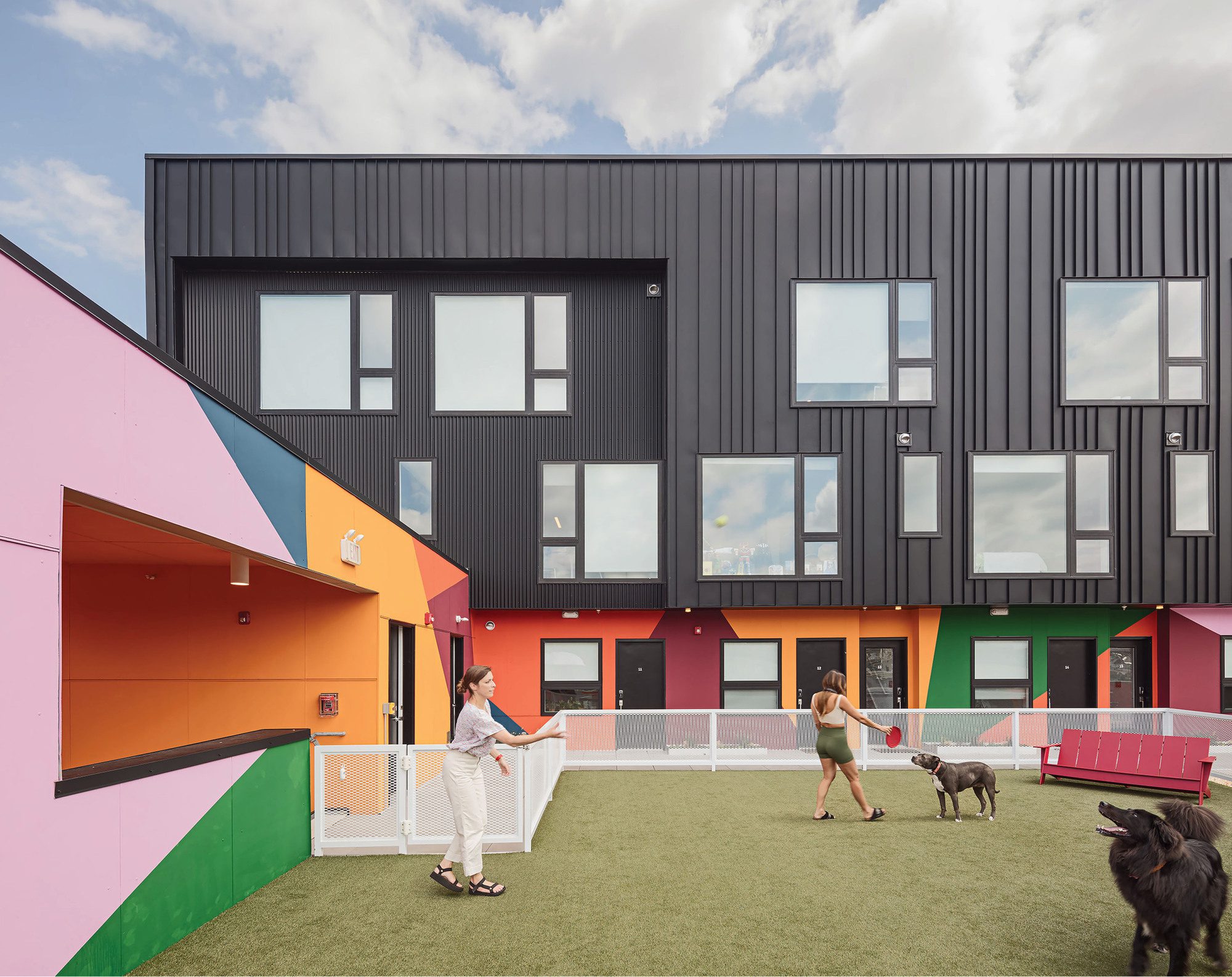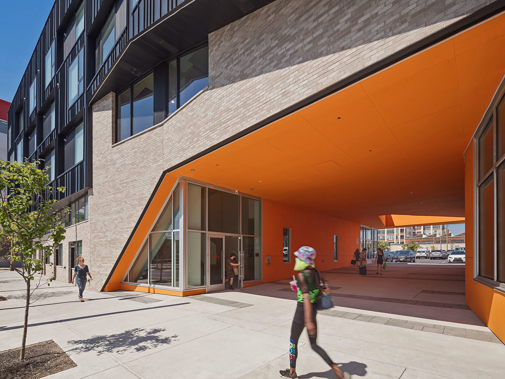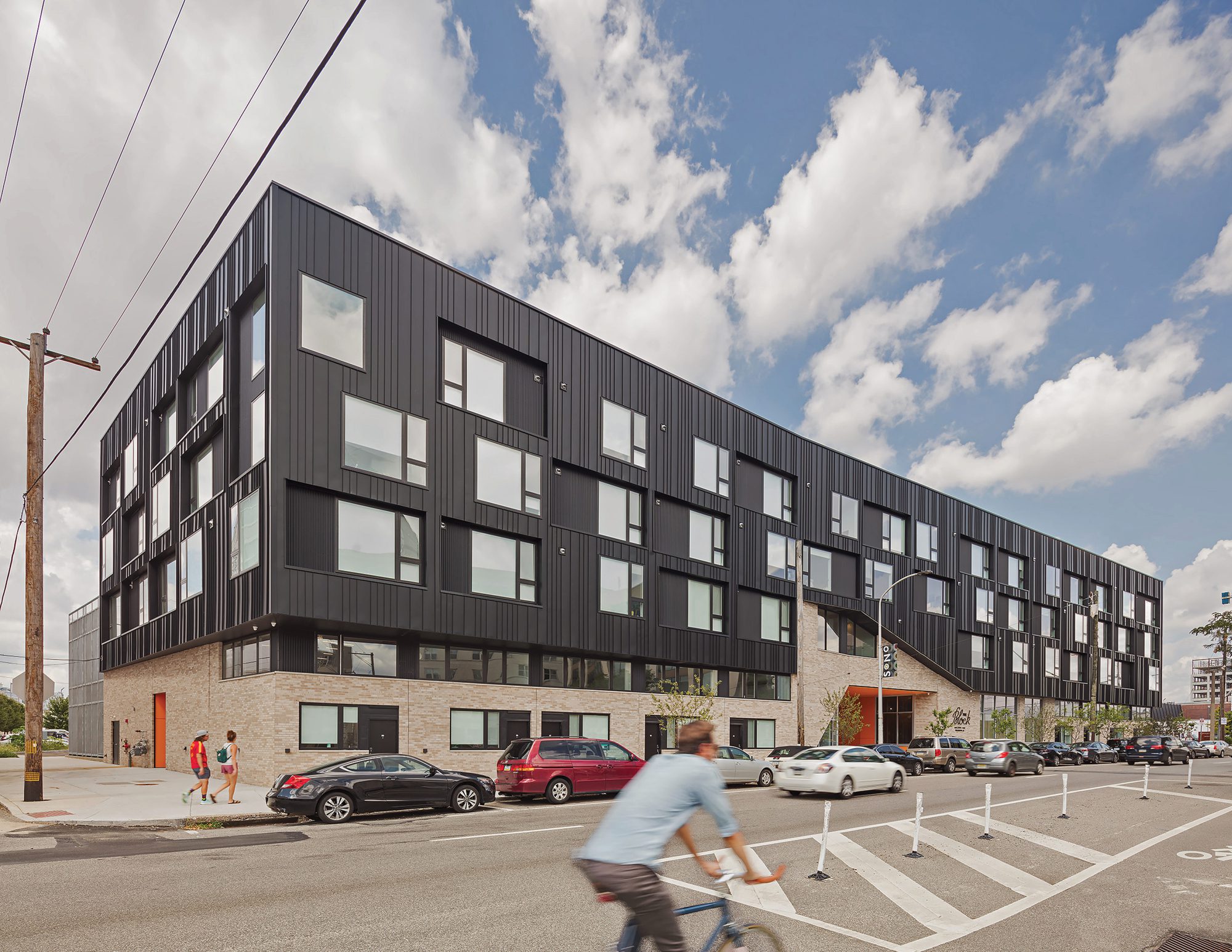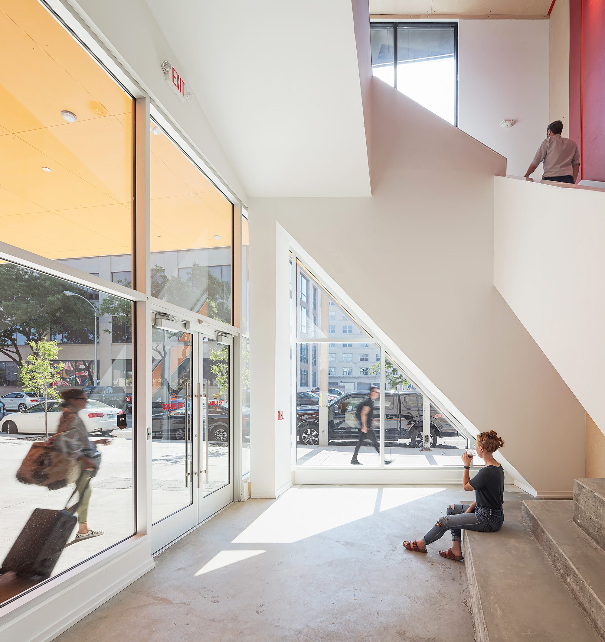 The Block, Big box buildings sited on abandoned industrial lots can bring new retail amenities to historically underserved neighborhoods, but their associated surface parking lots can negatively impact urban street life. The Block, a 49-unit mixed-use multifamily building situated on an existing surface parking lot in Philadelphia’s Callowhill zone, bridges that gap, adding density and supporting pedestrian walkability while taking advantage of existing car-centric development in a novel typology.