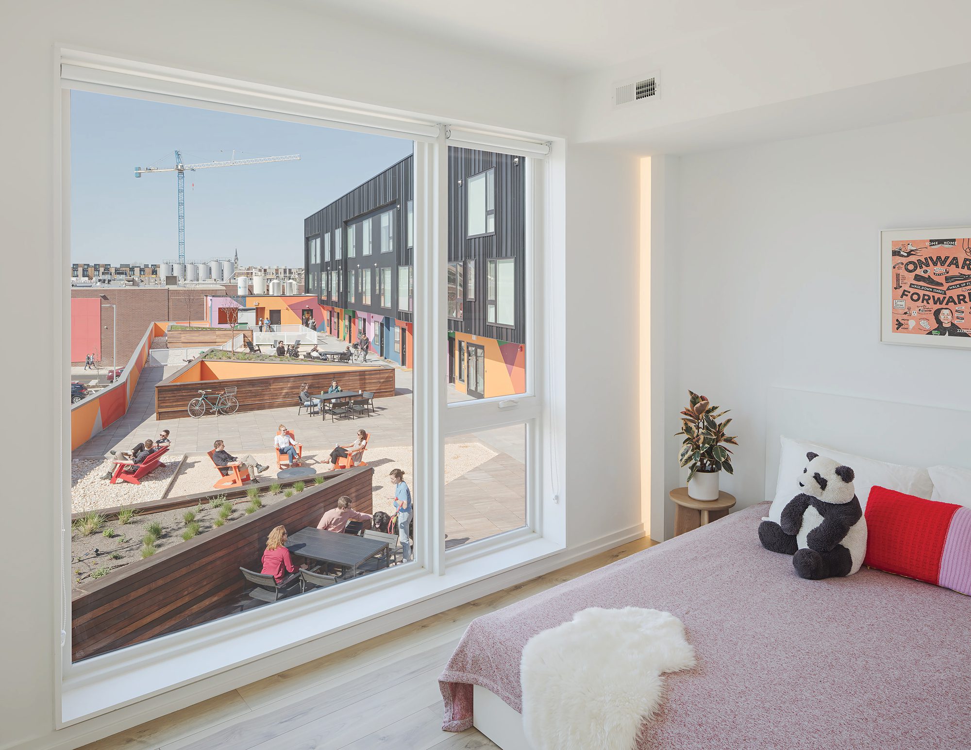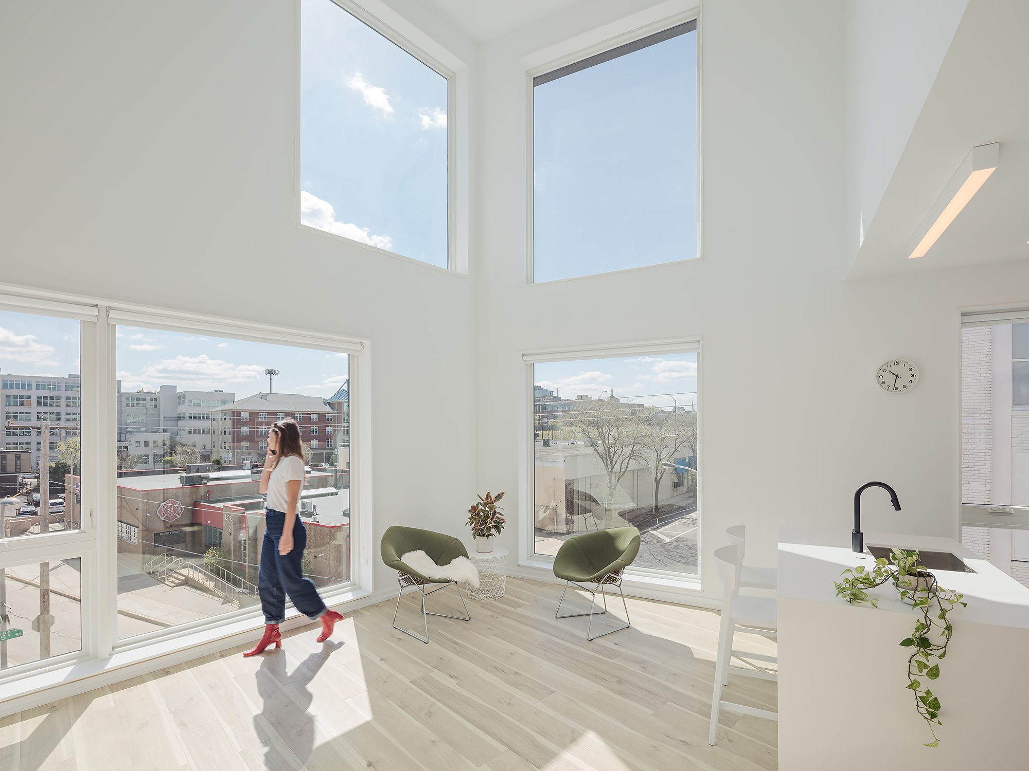 The building incorporates an unusual approach to circulation, taking cues from Philadelphia’s rowhouse fabric. Minimizing interior corridors, the building relies instead on an elevated, landscaped deck as the primary access for upper-level walk-up units. The massing features apertures in both plan and section, opening unexpected views, enhancing pedestrian access, and fostering a sense of porosity across the building’s layered streetscape.