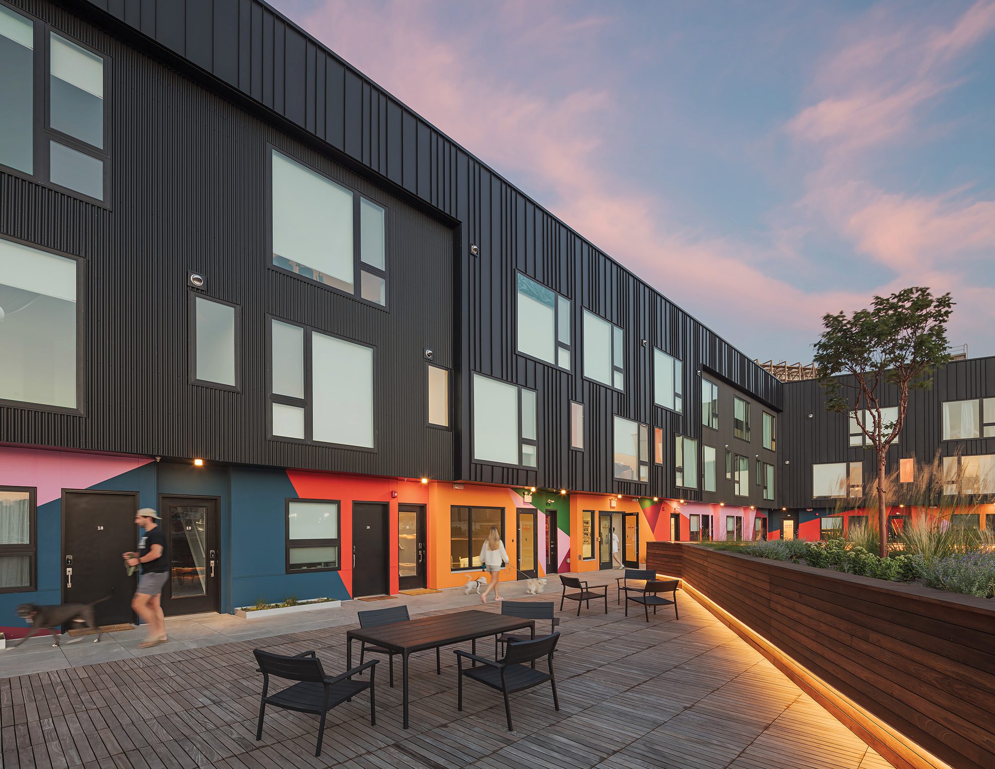 The Block was developed by the owners of the single-story warehouse immediately to the north, which was previously converted to house a local brewery and big box retail. The building lines the retail parking lot’s 5th Street frontage with live/work units and anchors its parking lot side with ground-floor retail. A pedestrian passageway cuts through the building at grade, and a social terrace occupies the roof above.