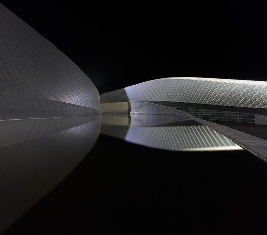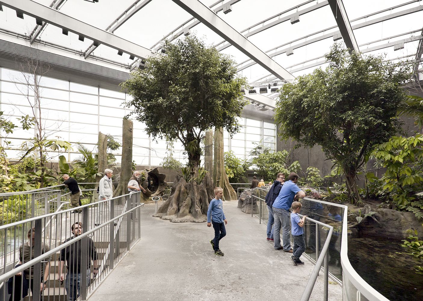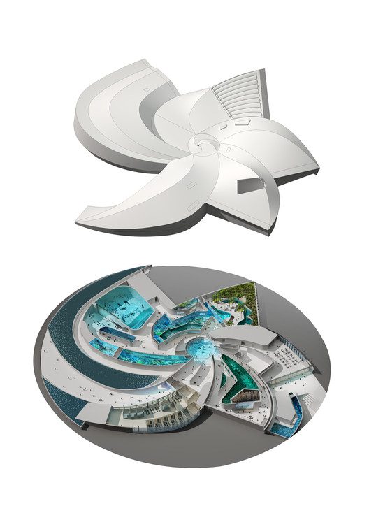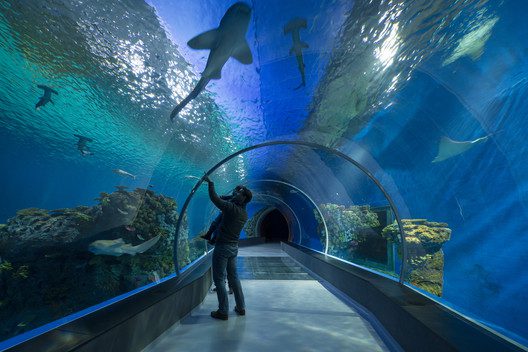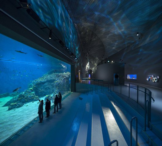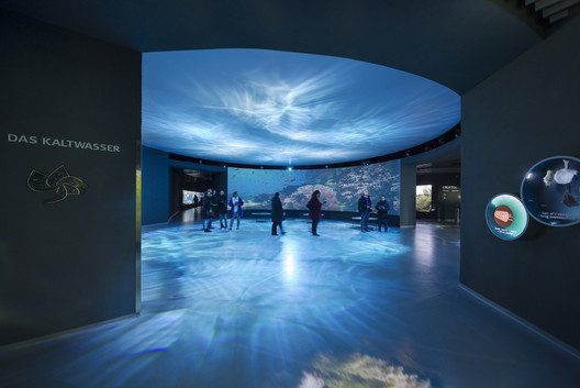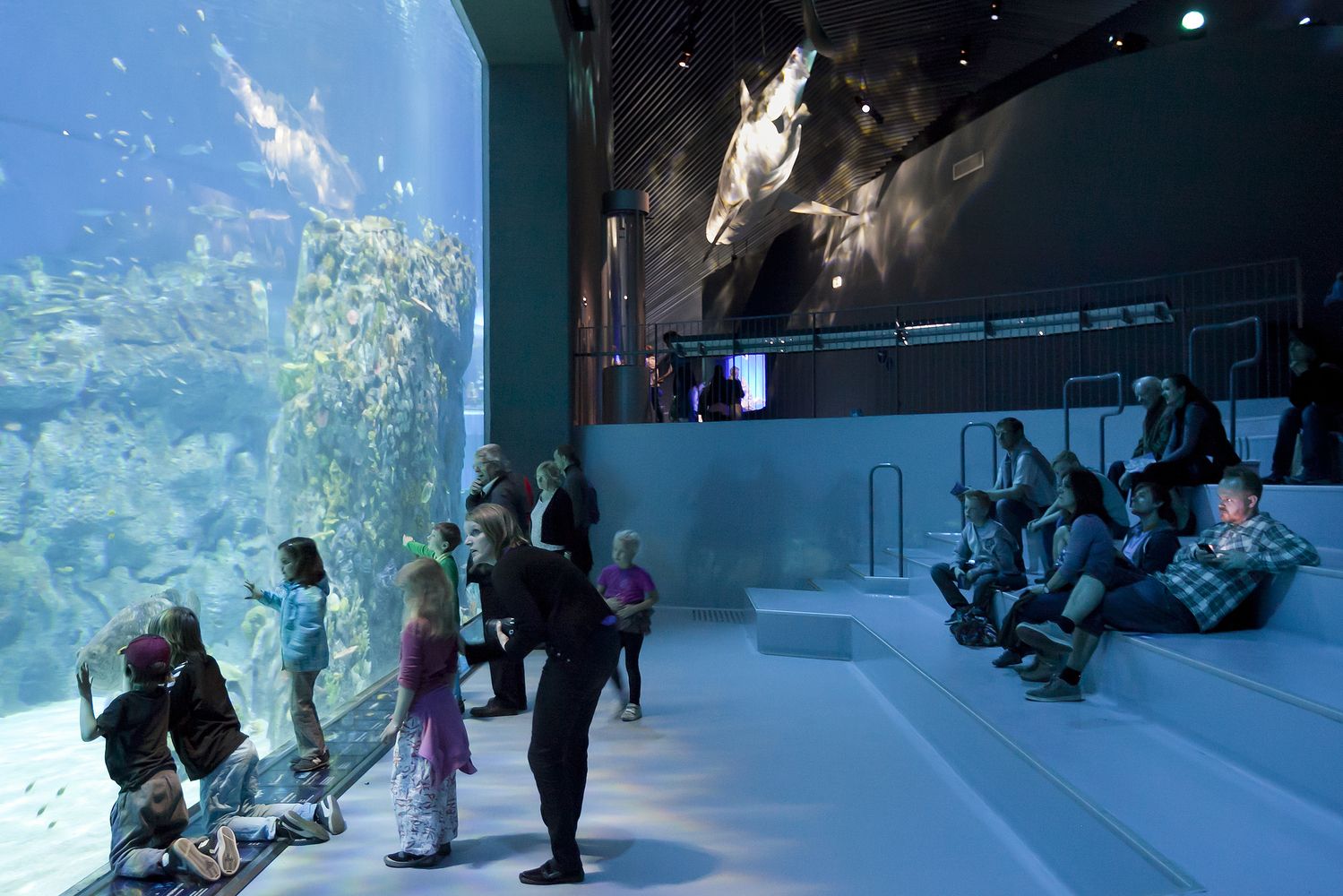 Approaching the aquarium on foot, one will observe the building floating in a circular reflecting pool. The building reaches out, enticing visitors inwards through a series of organically formed spaces until reaching the centre of the maelstrom, the Round Room, where occupants are presented with a choice of which hydroscape to observe first. The ceiling of this room is made almost entirely of glass, with one of the aquarium pools- teeming with aquatic life- located directly above. It is through this watery lens that the sky above is visible, completing the visitor’s sense of emersion.