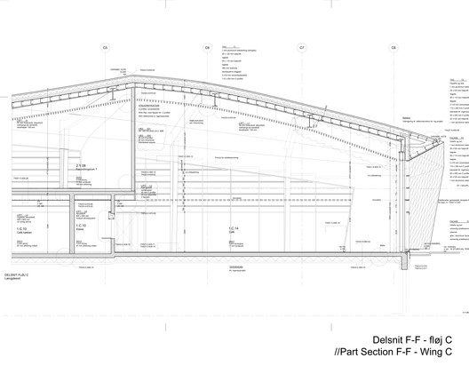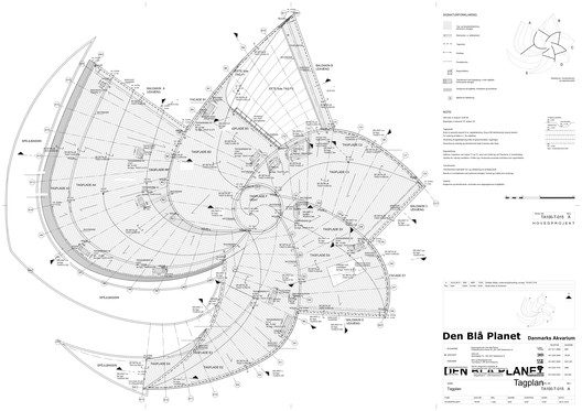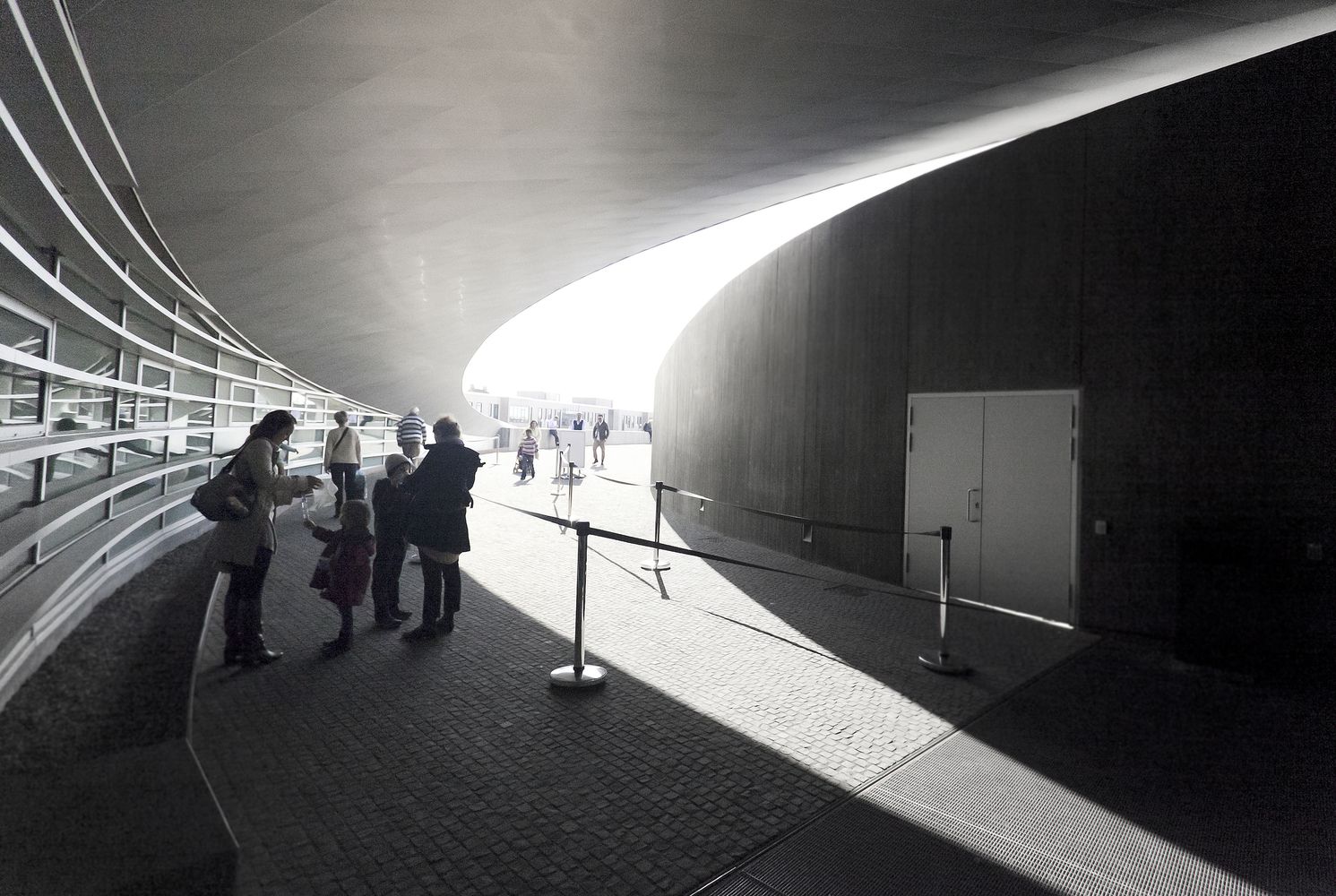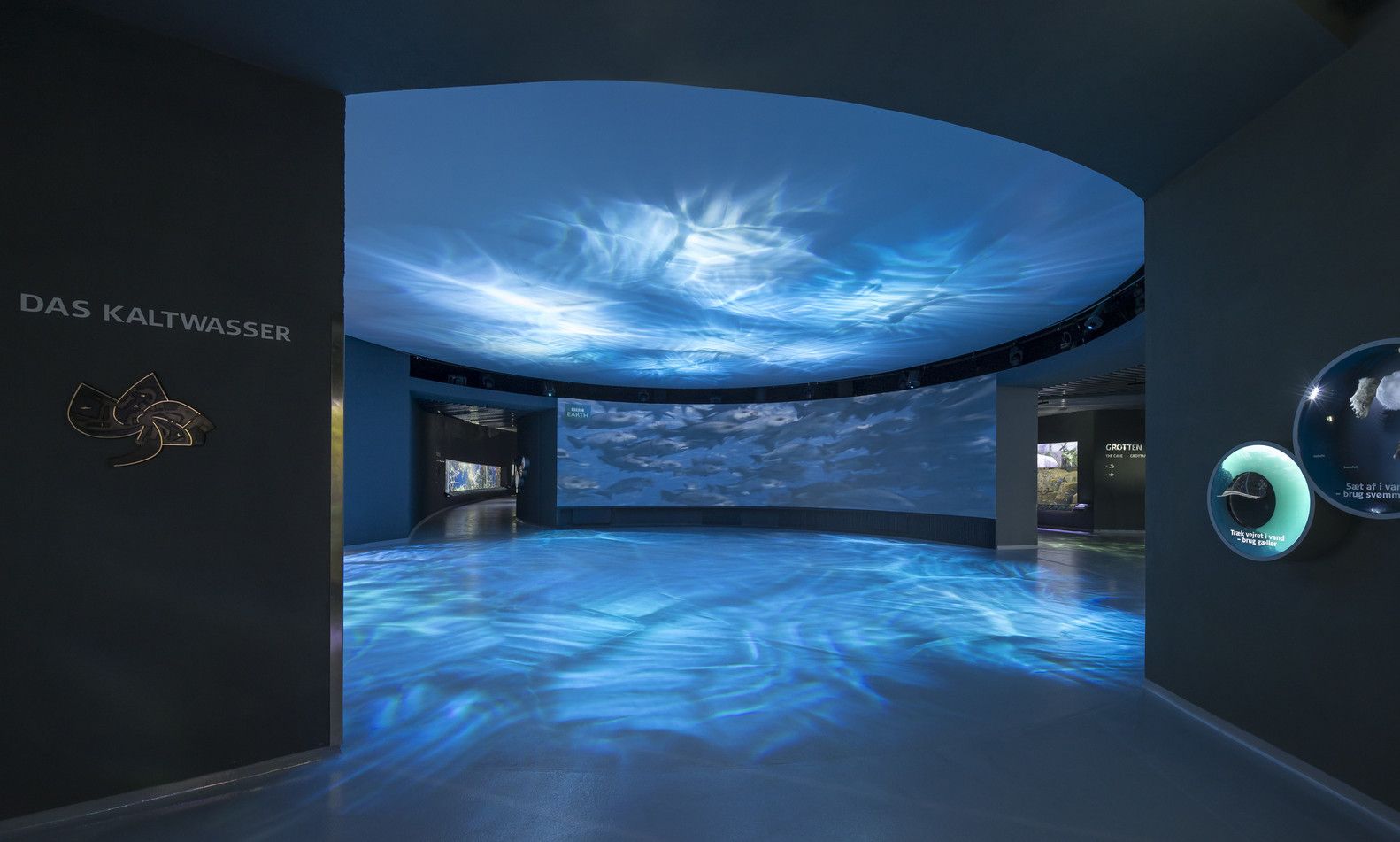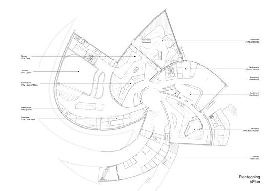 The different wings radiate off of the Round Room, each with its own ‘introduction space’ where sights and sounds the atmosphere exhibited beyond. These wings hold a second, hidden purpose. Coherent addition to the aquarium is possible by simply extending these whirling arms along their implied paths. It is through these arms also, that the building bridges water and land. Sitting as it does, raised several meters above the surrounding lands and overlooking the Øresund, the aquarium reaches out, becoming more than just one static building, while maintaining an overall identity.