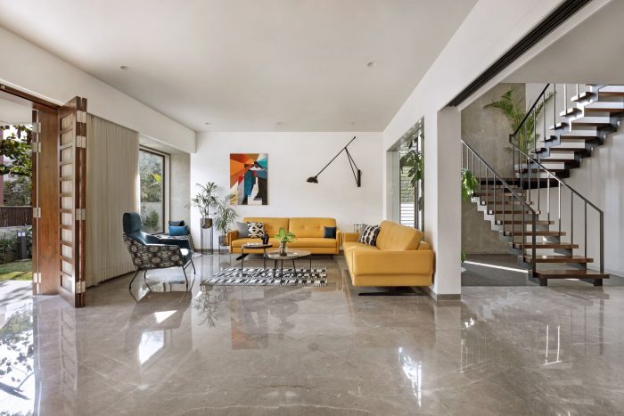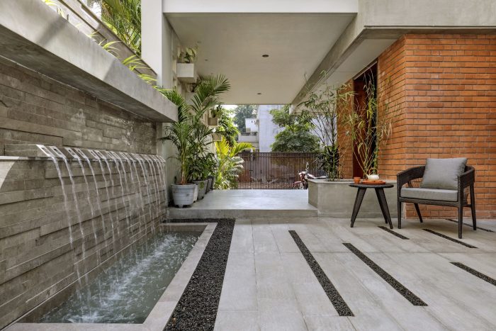 The Courtyard – The central courtyard was strategically designed to blur the boundaries between inside and outside. It further helps in establishing visual linkages and connections in all three dimensions. Along with the garden, it frames beautiful views for the living area. In line with the deck, it dispenses an experience of being set in the greens for the dining. In the vertical axis, it connects all the floors exuding different experiences at each level. The black terrazzo flooring done on site by local craftsmen and the umbrella tree becomes the highlight on the ground floor, the play of natural light through the slit window on the first and the sciography cast by the skylight on the second. Lastly, this courtyard houses the staircase. With its sleek design in wood and metal in line with the house’s furniture concept, the staircase is crafted elsewhere and then assembled on site.