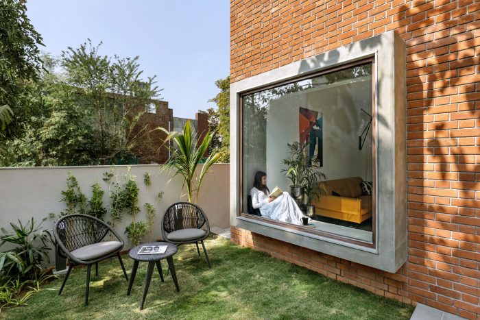 The Window Seating – Designed to add character to the façade, the window seating was designed in sync with the box concept. A shift in material from brick to exposed grey plaster distinguishes this volume on the exterior. Connecting the garden with the interior this seating in the living room is a cozy nook to sip a cup of coffee while enjoying the view.