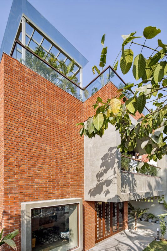 The facade is flanked by balconies and terraces at different levels to cut the direct entry of sunlight thus acting as buffer for the main functional spaces. The elevation thus strikes a balance between solidity and transparency. Boxes are used as elements to add character to the climate responsive balcony of the master bedroom. A shift in material from brick to exposed grey plaster distinguishes this volume. This concept of boxes is then taken further while developing the overall design language. The interior colour scheme is conceptualized to be neutral and the material palette minimal. All the furniture is either customized as per design or handcrafted on site as per details. Wood and metal became the key elements while developing the furniture. Used differently at different spaces against the subtle backdrops of white and grey, these materials are then overlaid with pastel furnishings and accessories.