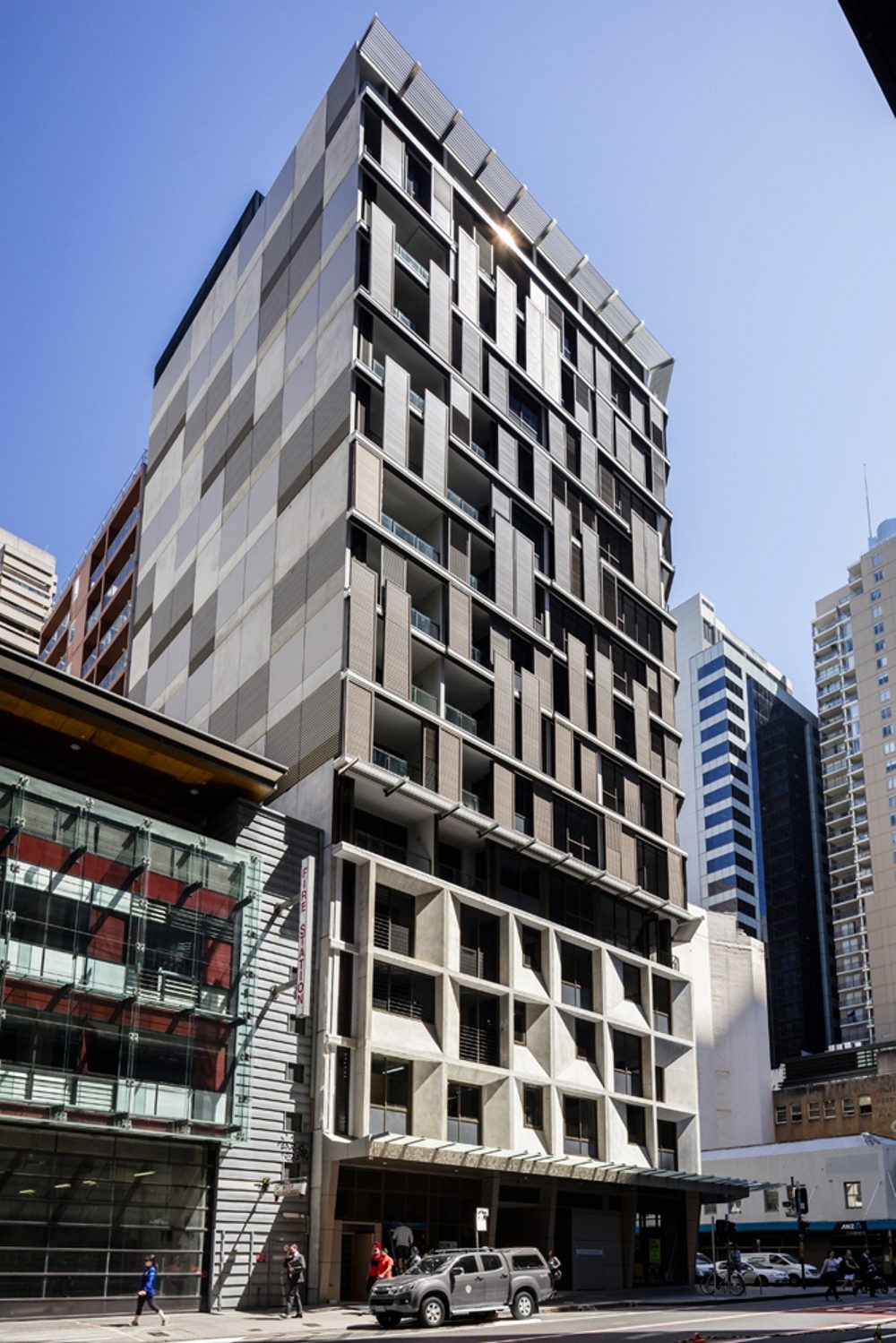 The 5 level podium is predominantly precast concrete. This was chosen as it is consistent with a number of the surrounding buildings which have a solid expression predominantly in concrete. The podium takes the form of angled widow boxes. These boxes are angled to maximise sun penetration and create a stark modelling in sunlight. This articulation creates a lively contemporary expression which reflects its surroundings.