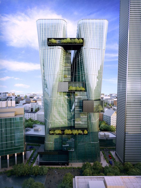 Parramatta Proposal, symbol of Parramatta new Rise, the concept design for the office towers 5 and 6 is expressed via both a vertical torque and outward projection towards the public mall.