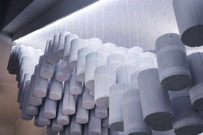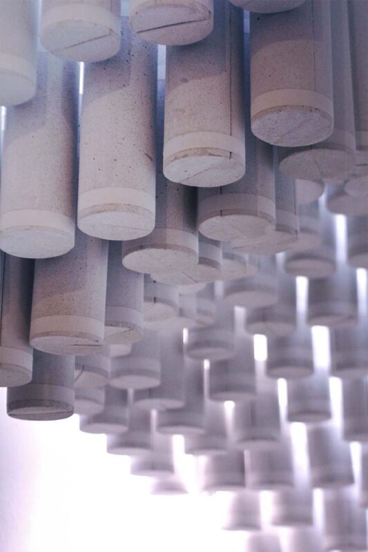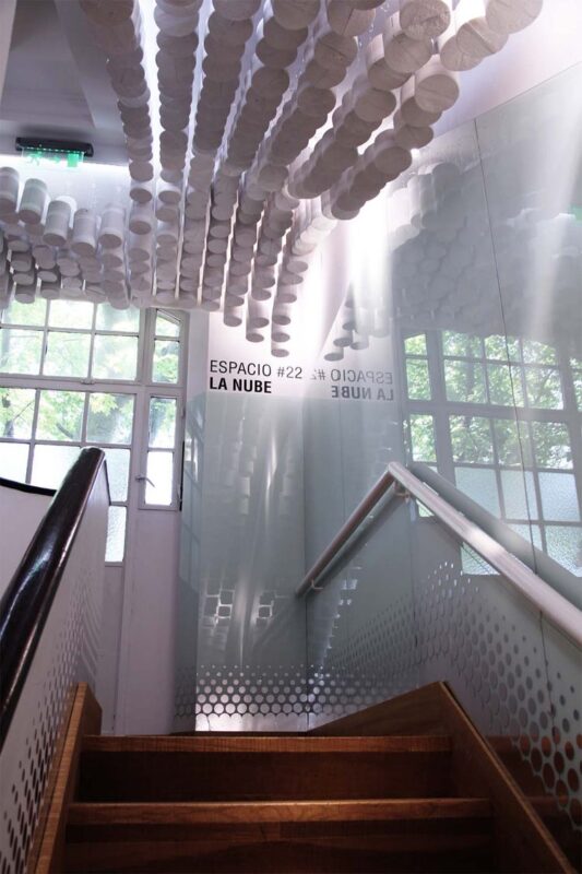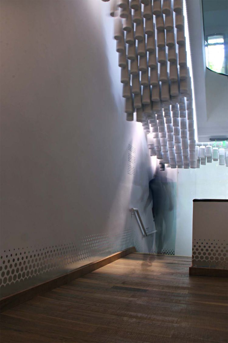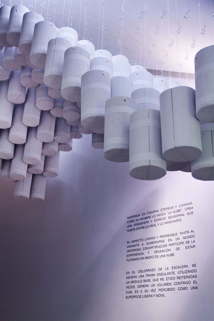 Using materials that were destined to be discarded, the duo has created a design that allows one to drift in an illusion. Elements used, such as light, allow for a more engaging atmosphere. “The Cloud” installation is made out of pipe shaped Polyurethane foam; after many processes of cutting, measuring, assembling and painting, the undulating installation hangs above the wooden stairs.