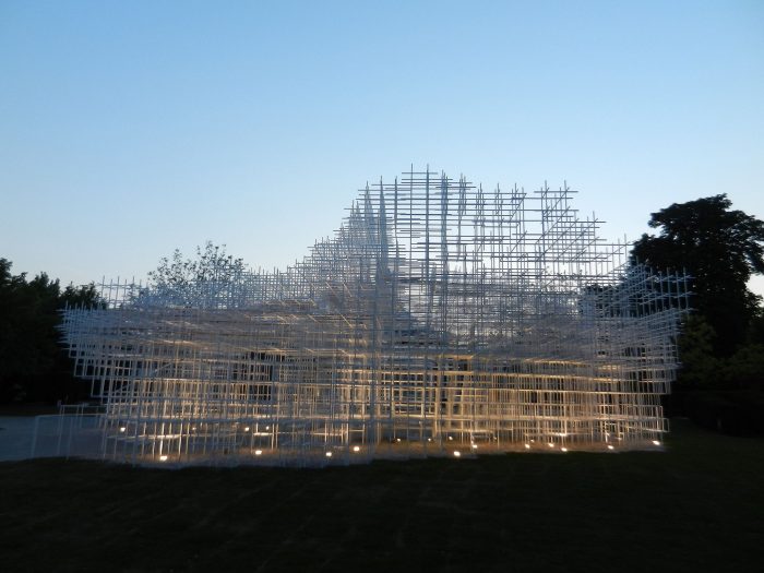 The Serpentine Pavilion 2013 is a delicate, three-dimensional, latticed structure, each unit of which is composed of fine steel bars. It forms a semi-transparent, irregular shape, simultaneously protecting visitors from the elements while allowing them to remain part of the landscape. The depth of the grid at different locations will create thicker walls or thinner, transparent sections.