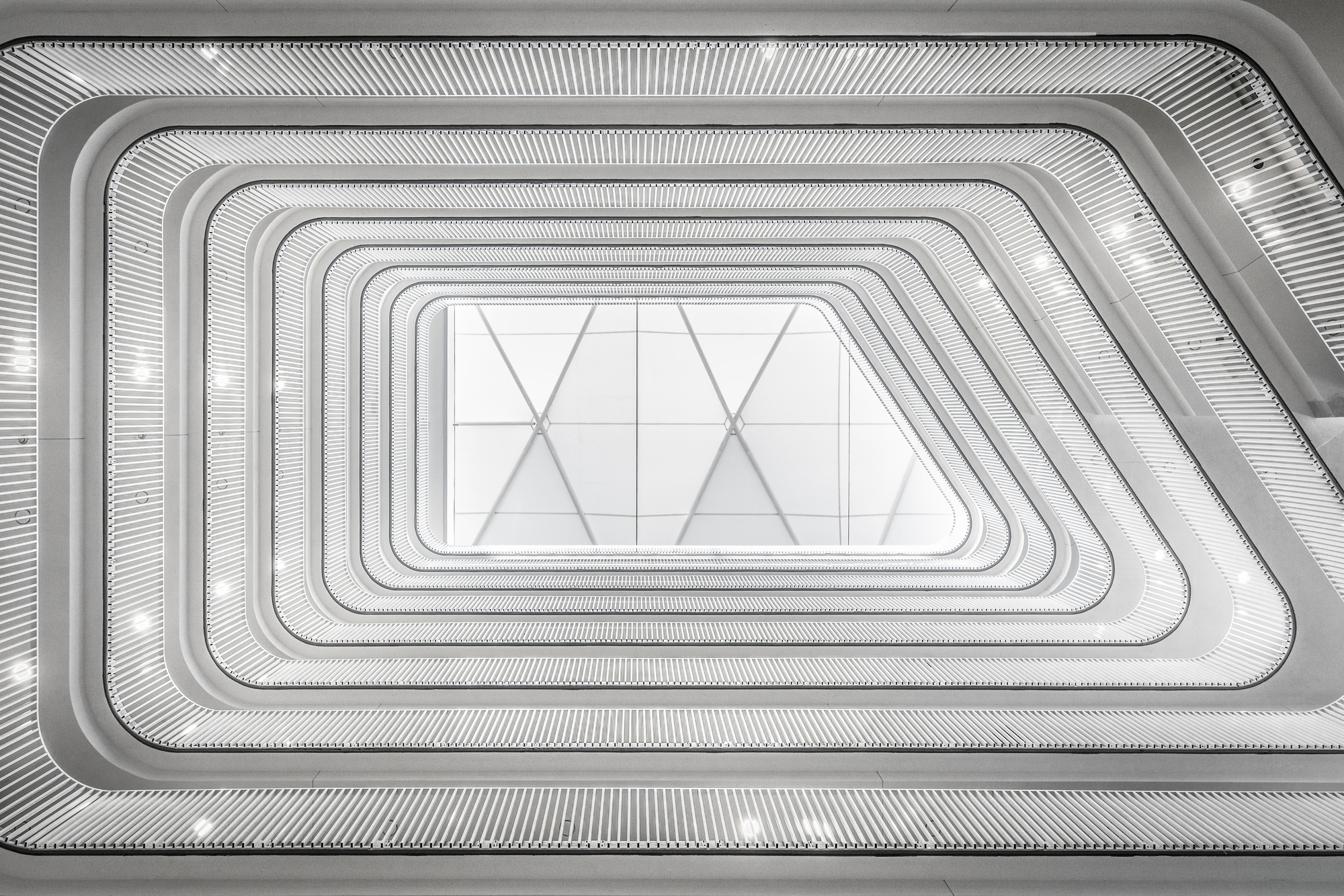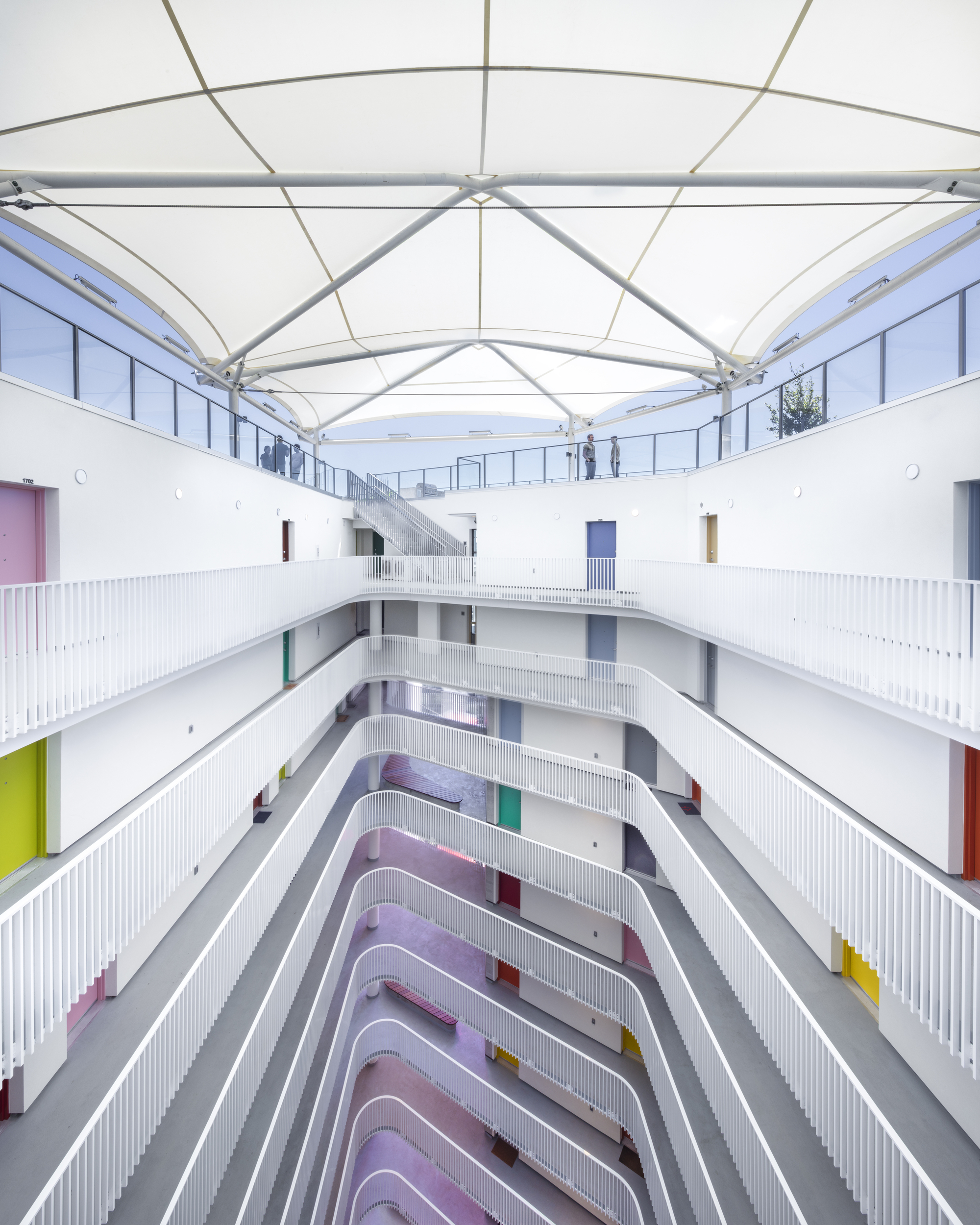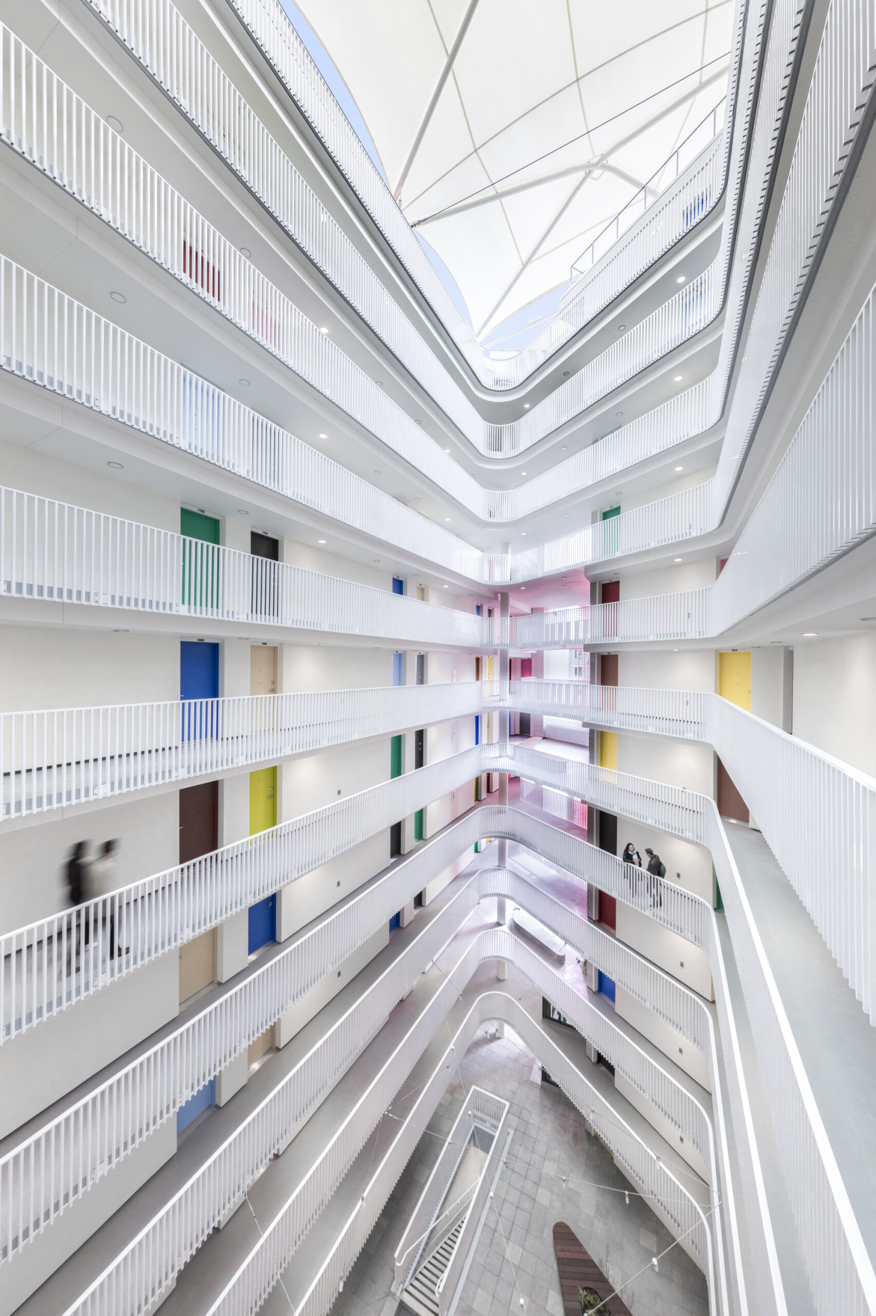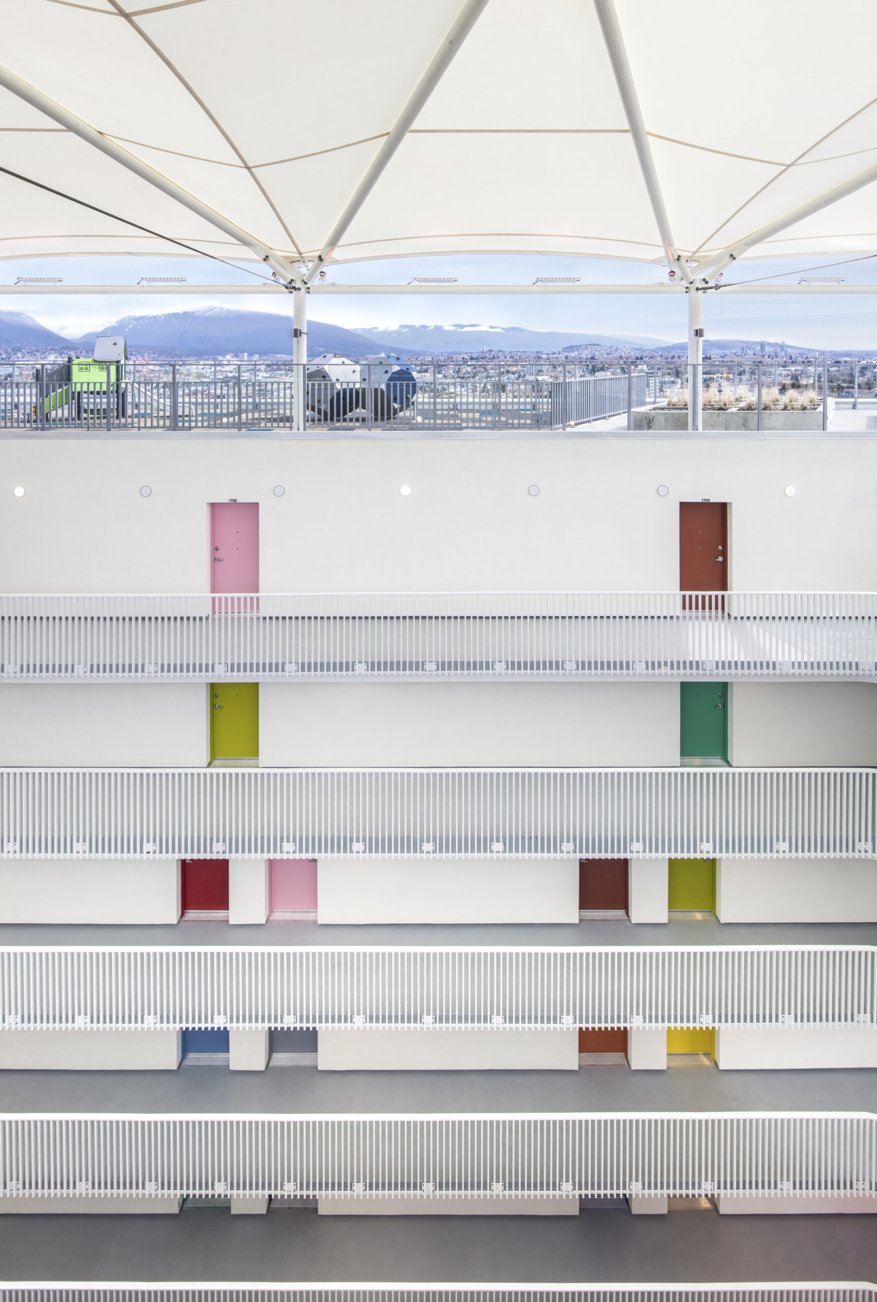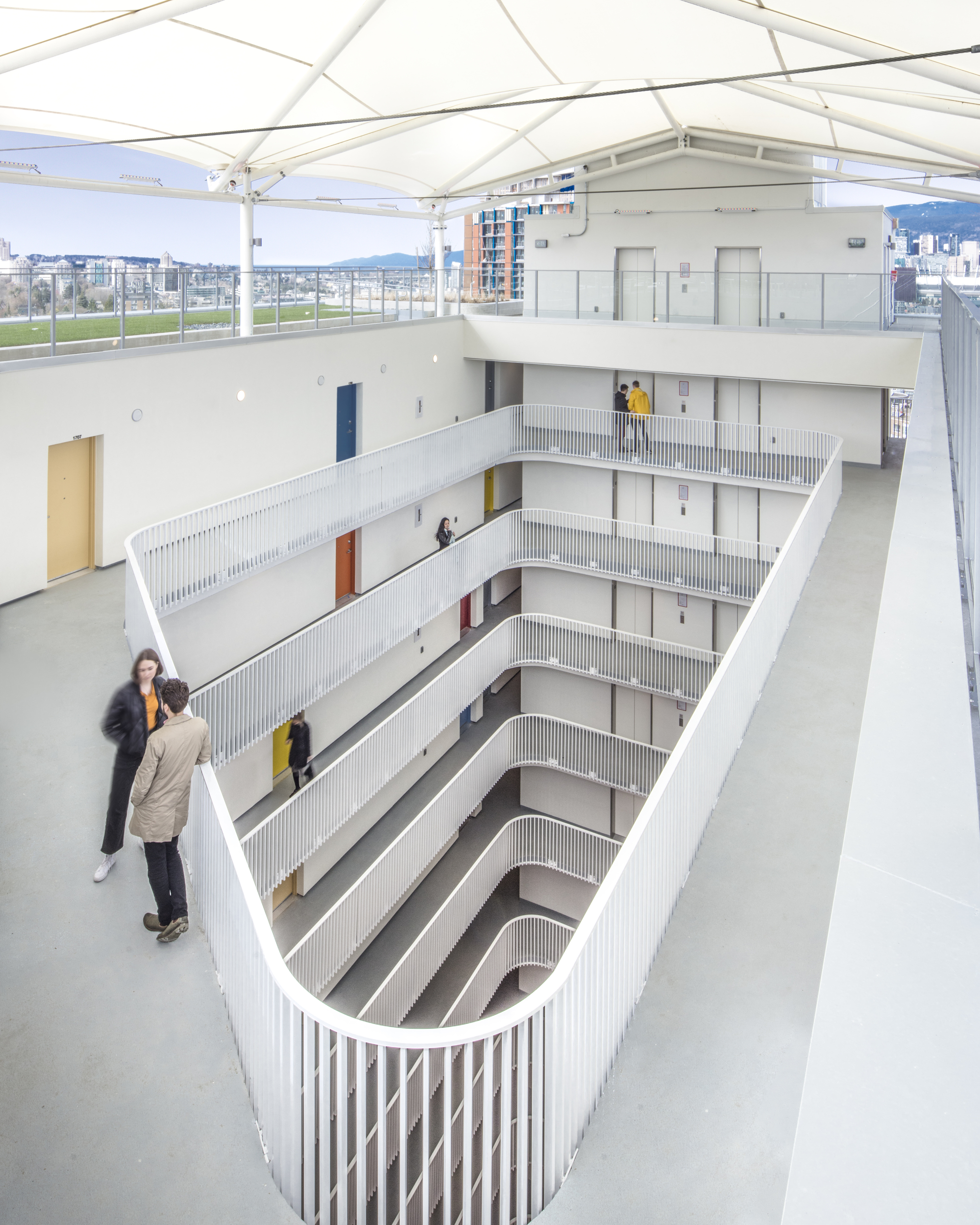 The trapezoidal shape of the site creates a dynamic spatial quality to the atrium that is further enhanced through the play of multi-coloured entrance doors against a backdrop of white finish surfaces. A narrow, vertical south-facing slot provides glimpses into and out of the atrium space; while an 18-metre high, pink-coloured hanging art installation washes shafts of coloured light into the brilliant white atrium. Three communal outdoor landscaped terraces span the sunlit slot to stimulate impromptu social interactions between residents. Two amenity rooms are located on the uppermost floors with direct stair access to the rooftop terrace amenities that includes a children’s play zone, urban agriculture, a dog-friendly space, and social seating with a barbeque area.