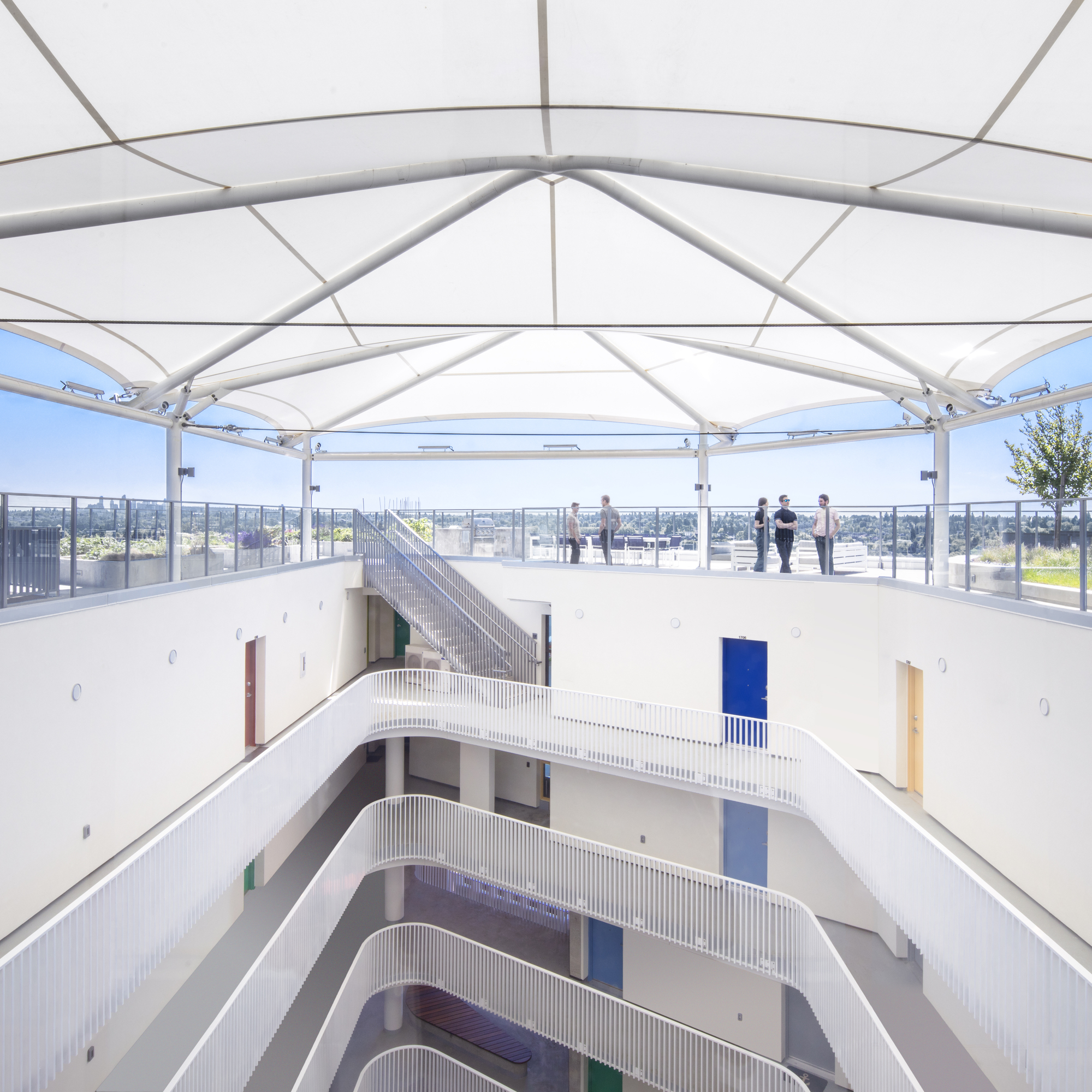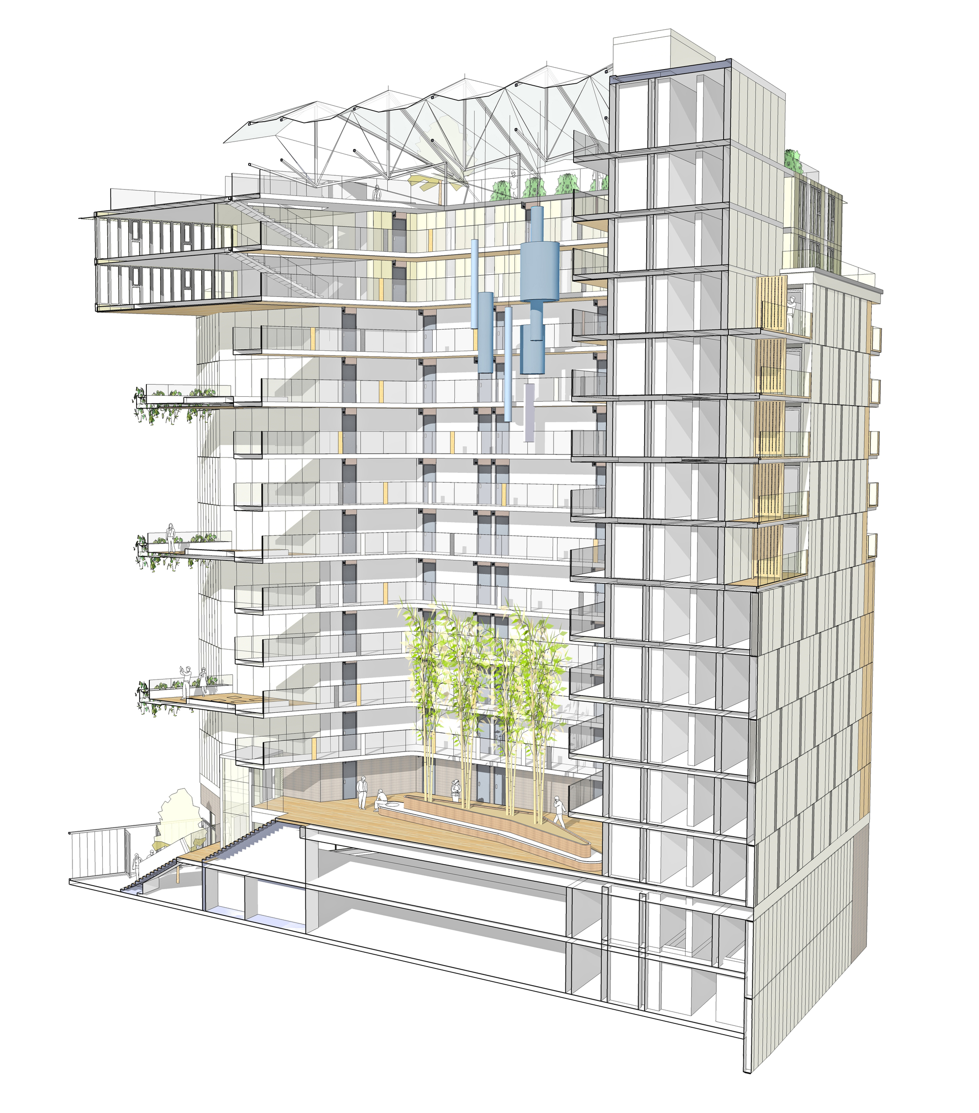 To achieve economic viability as a rental development, the project had to achieve a relatively high density within a 14-storey height limit imposed by the City. Use of a typical double-loaded corridor form of development set back from the lot lines could not realize the density required for economic viability. To achieve the required density, the living units are pushed out to the lot lines, thereby accommodating a greater number of units on the site. Positioning the units at the perimeter of the site created a figure/ground plan configuration with a void at the centre that was developed as a soaring open-air circulation space to access the units. A high-tensile steel and Teflon membrane structure is suspended above the open-air atrium to protect the space from the elements, with portions extending past the void to shelter portions of the extensive rooftop communal terrace.