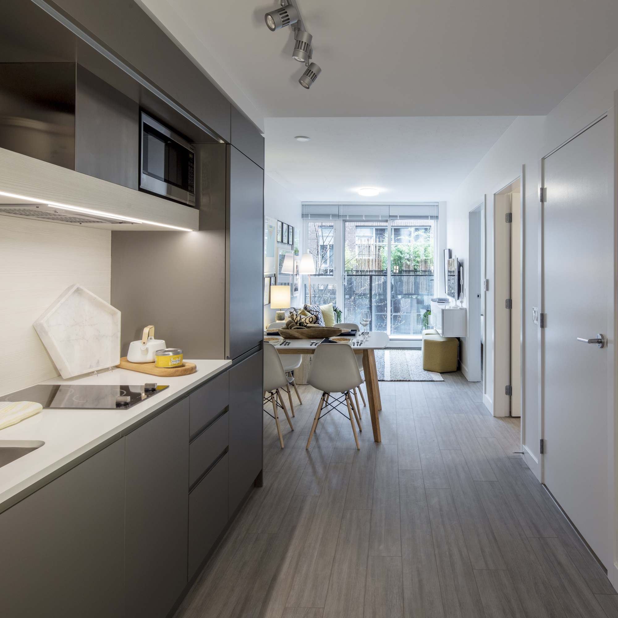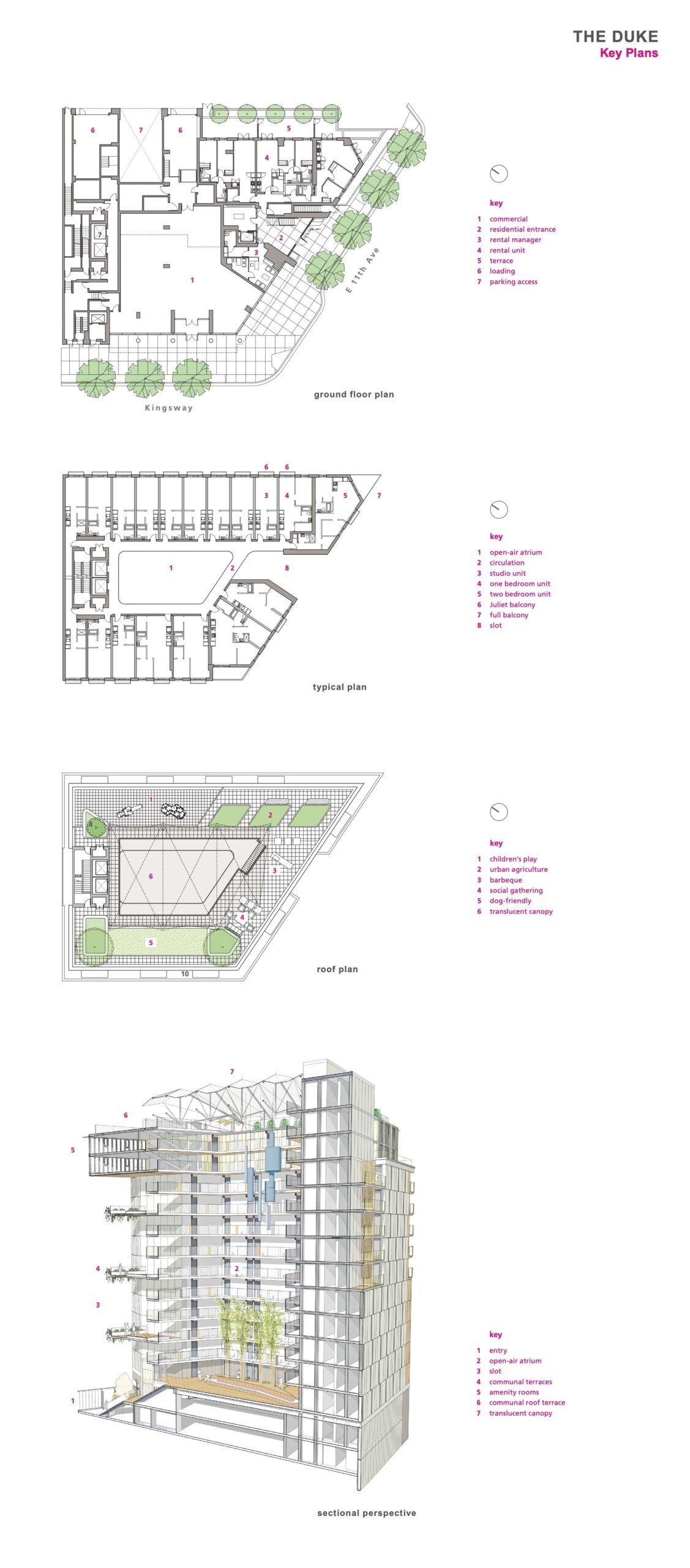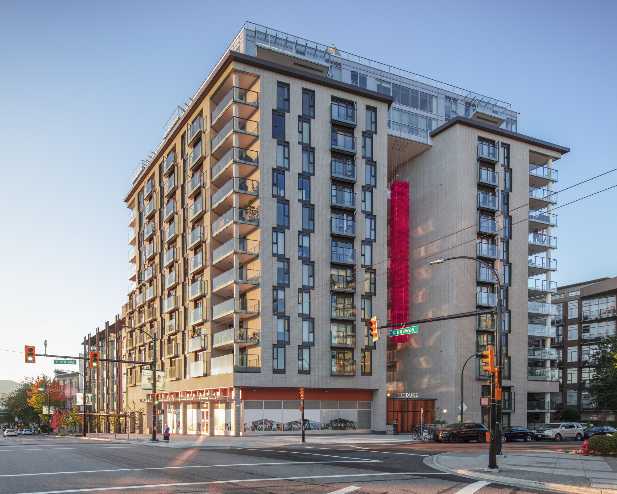 The Duke Housing, In recent years, the City of Vancouver introduced housing policies to address current and future needs for housing affordability and choice in the ever-evolving urban environment. The new policies allow strategically located sites to be rezoned to permit greater height and density in exchange for developers committing to provide and operate rental housing for a period of 60 years or for the life of the building. The Duke responds to these challenges with a new rental building typology inspired by precedents from the UK. The Duke is a 14-storey mixed-use development with 12-storeys of residential rental accommodation located above a two-storey commercial podium. The unit mix comprises 25% two-bedroom family units with one-bedroom and studio units making up the balance.