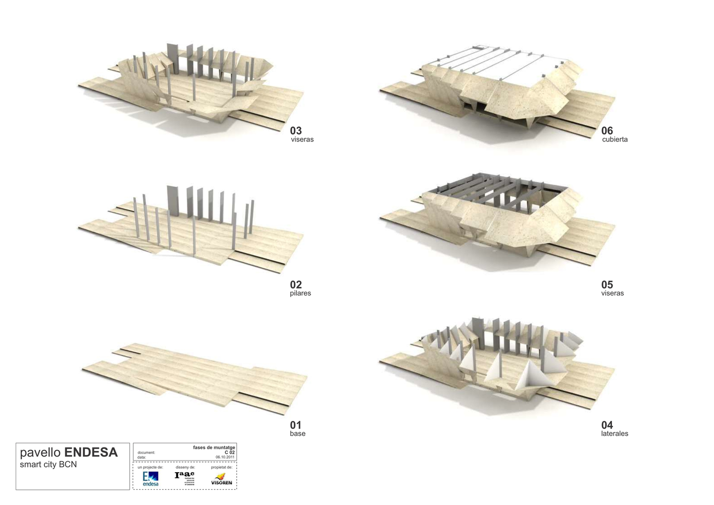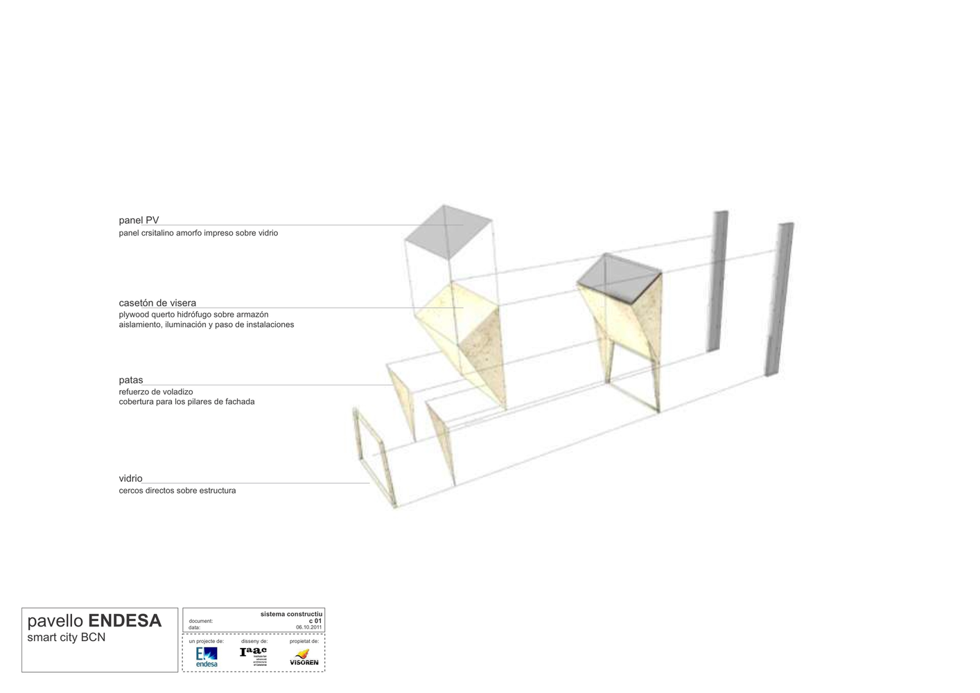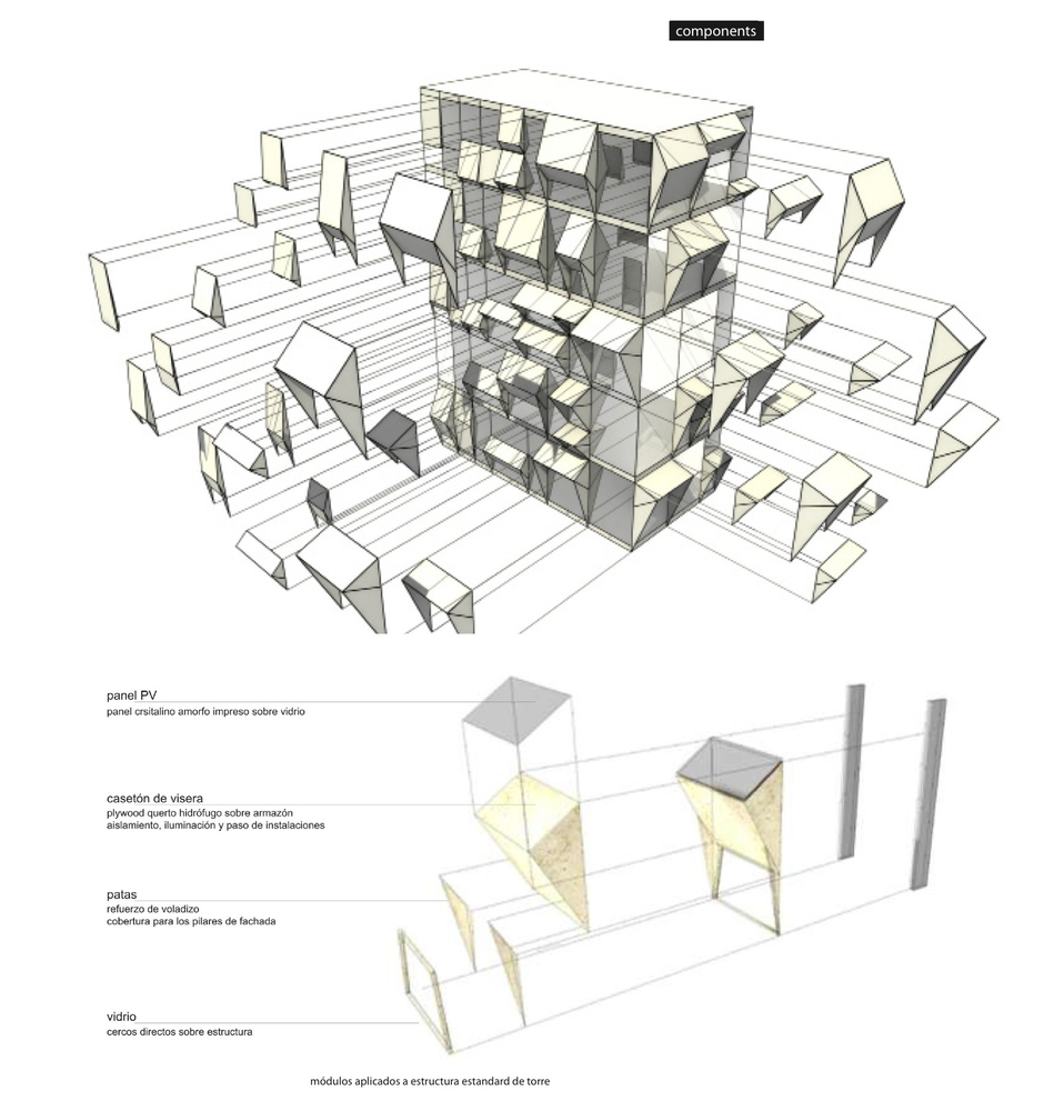 The pavilion is actually the prototype of a multi-scale construction system. A facade composed by modular components, like solar brick, that respond to photovoltaic gaining, solar protection, insulation, ventilation, lighting … The same parametric logic adapt façade geometries to the specific environmental requirements for each point of the building. It is is a single component that integrates all levels of intelligence that the building needs.From “form follows function” (classic XX century statement) to “form follows energy”.