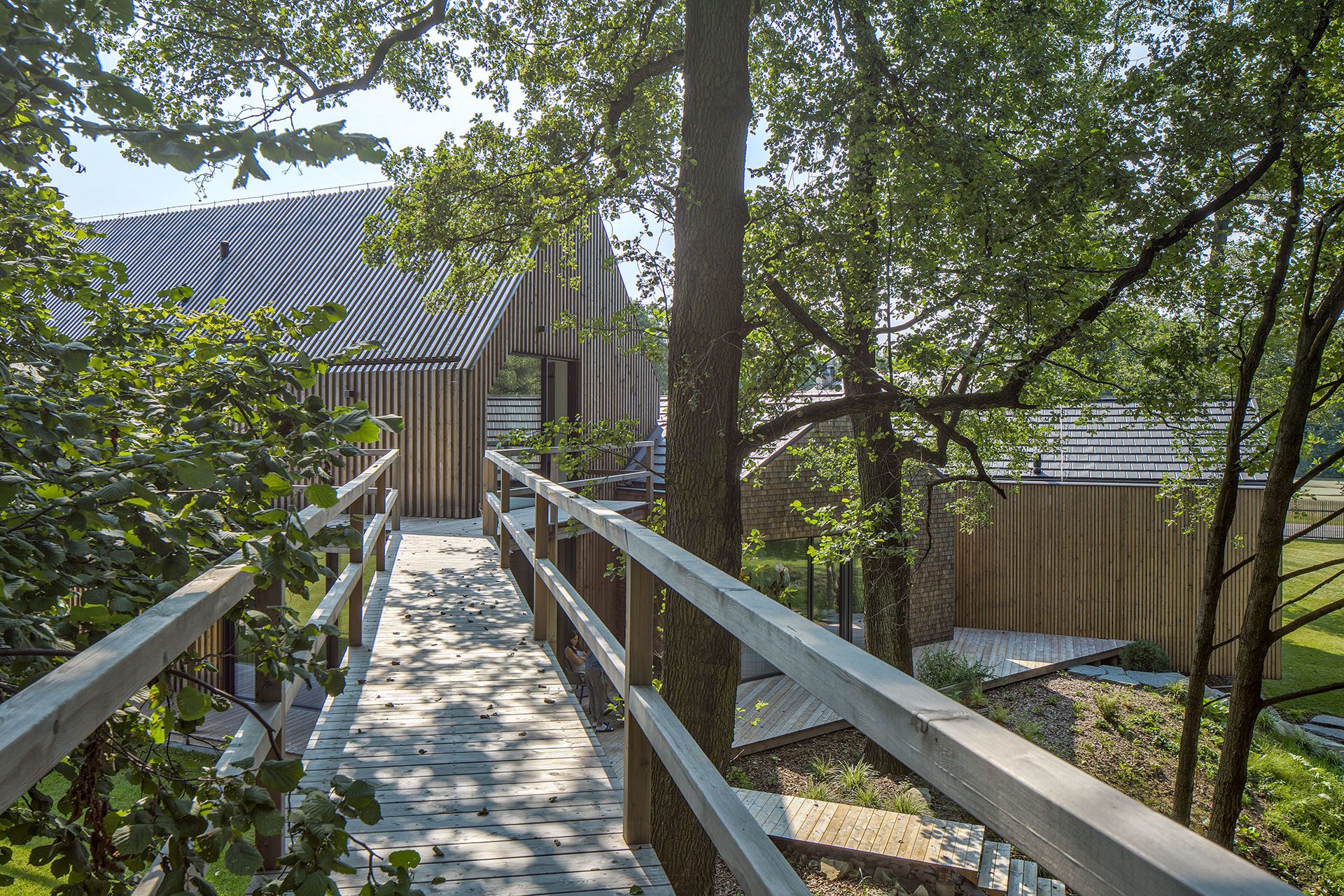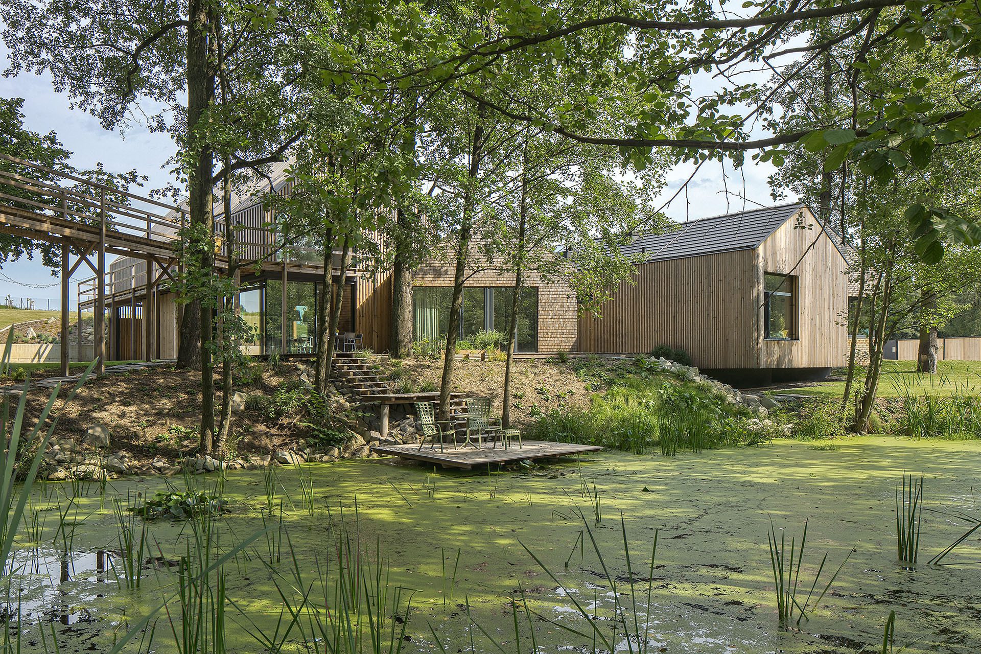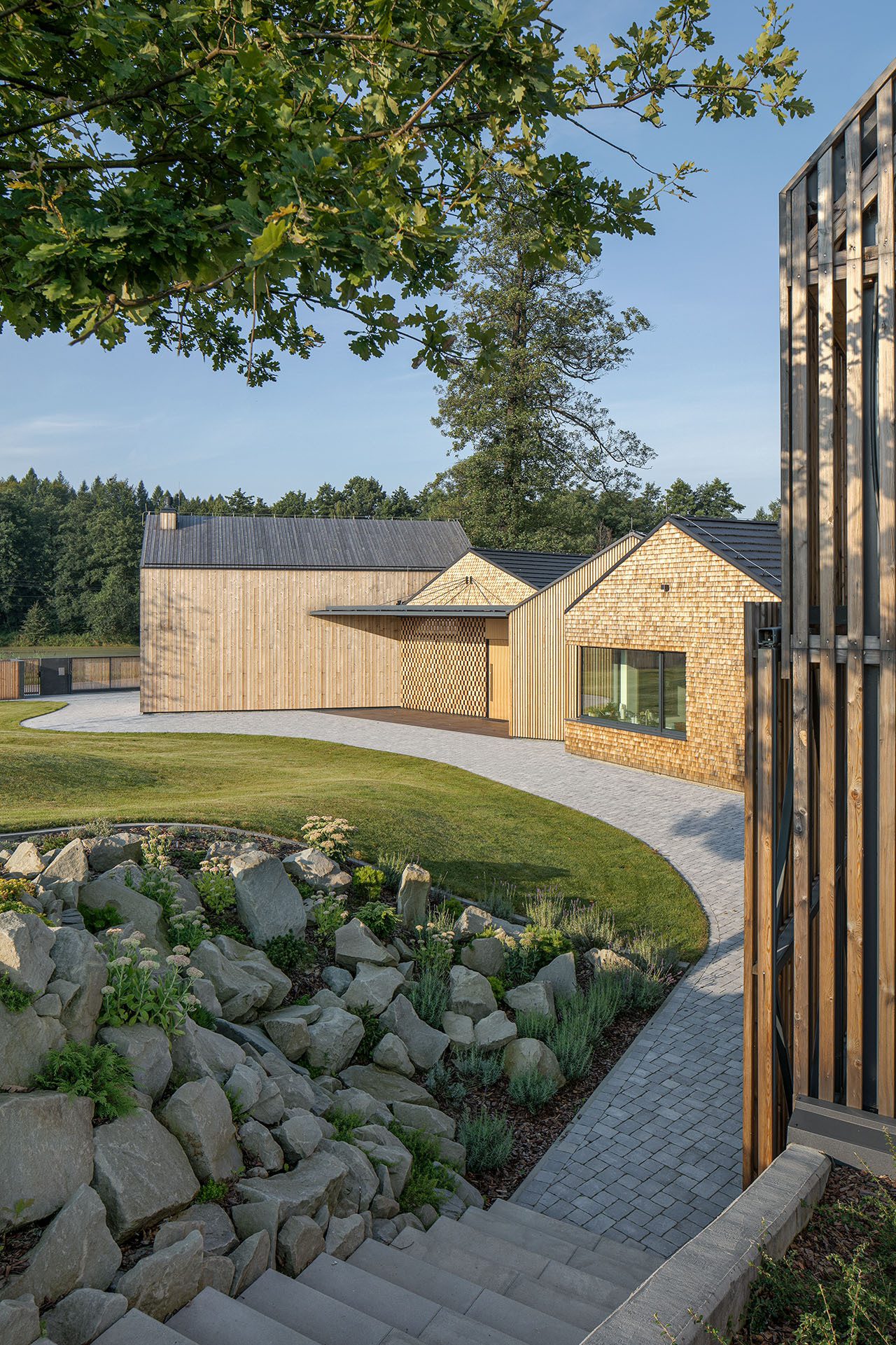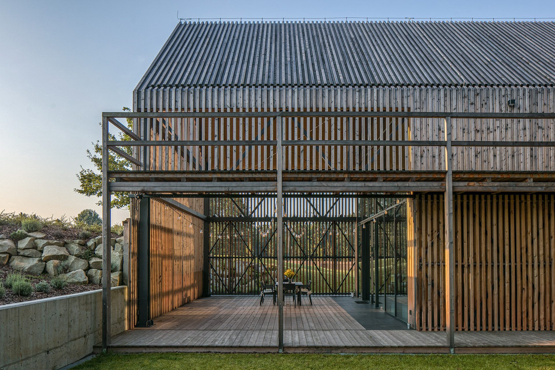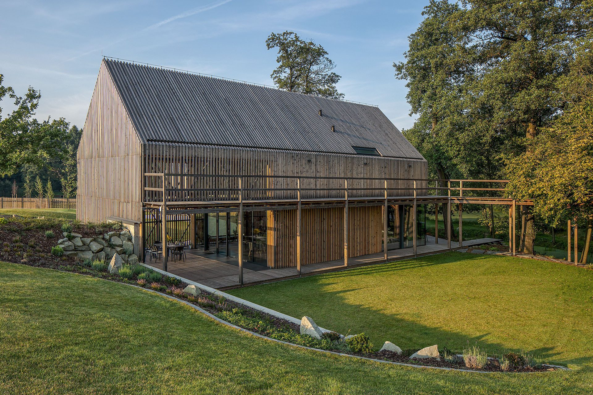 When creating the individual barns of The Farmhouse, we were guided by a harmonious approach to nature, primarily to the play of light and shadow, terrain, existing greenery, and infrastructure. Large, sunlit glazing has been shaded with an openwork facade, terrace roofs, or dense greenery. Thanks to this, the house will not be exposed to excessive sun exposure in the summer. Guided by the principle of sustainable development, we made sure to preserve the valuable tree stand. To better integrate the building with the extremely valuable and beautiful landscape, we designed a footbridge on the first floor and platforms on the ground floor, which then adjust to the topography of the area.