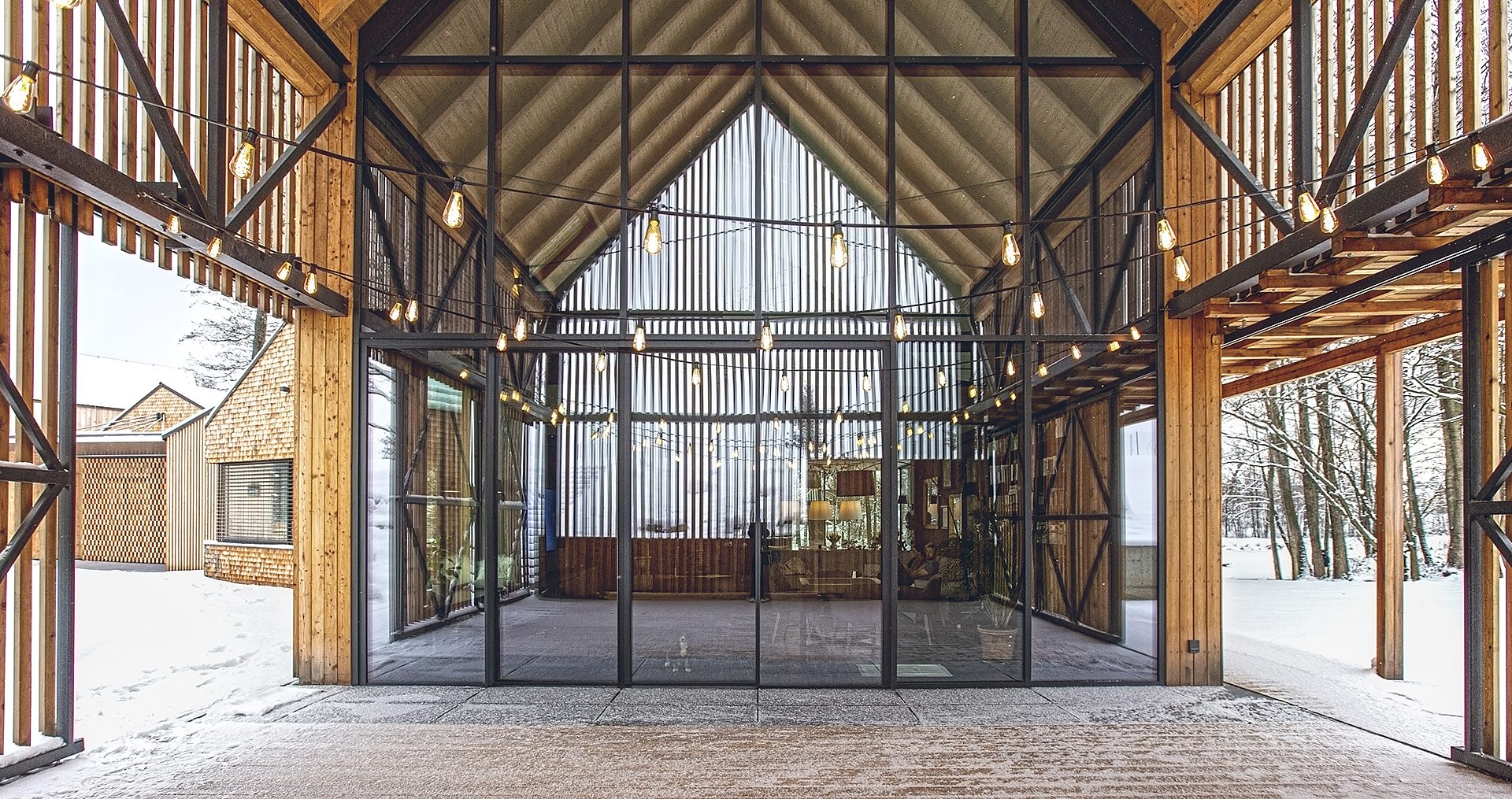 The next stage of the future development will include the creative reconstruction of the old house due for demolition. We proposed to restore its original, beautiful proportions, disturbed by extensions from later years. We have enhanced the entrance with a new roof, linking back to the original wooden ornamentation of the historic facade. Inside the house, we unveiled the original building material – red brick- to bring out its natural beauty. The reconstructed tiled heating stove is displayed in the main, two-level space covered by a wooden roof. What distinguishes this house from others is the lack of a fourth facade in the traditional sense. The fully-glazed wall allows the structure of the house to be exposed to the outside and towards the fireplace terrace of the new house. The old house is surrounded by colorful plants and flowers characteristic of this type of rural, historical building.