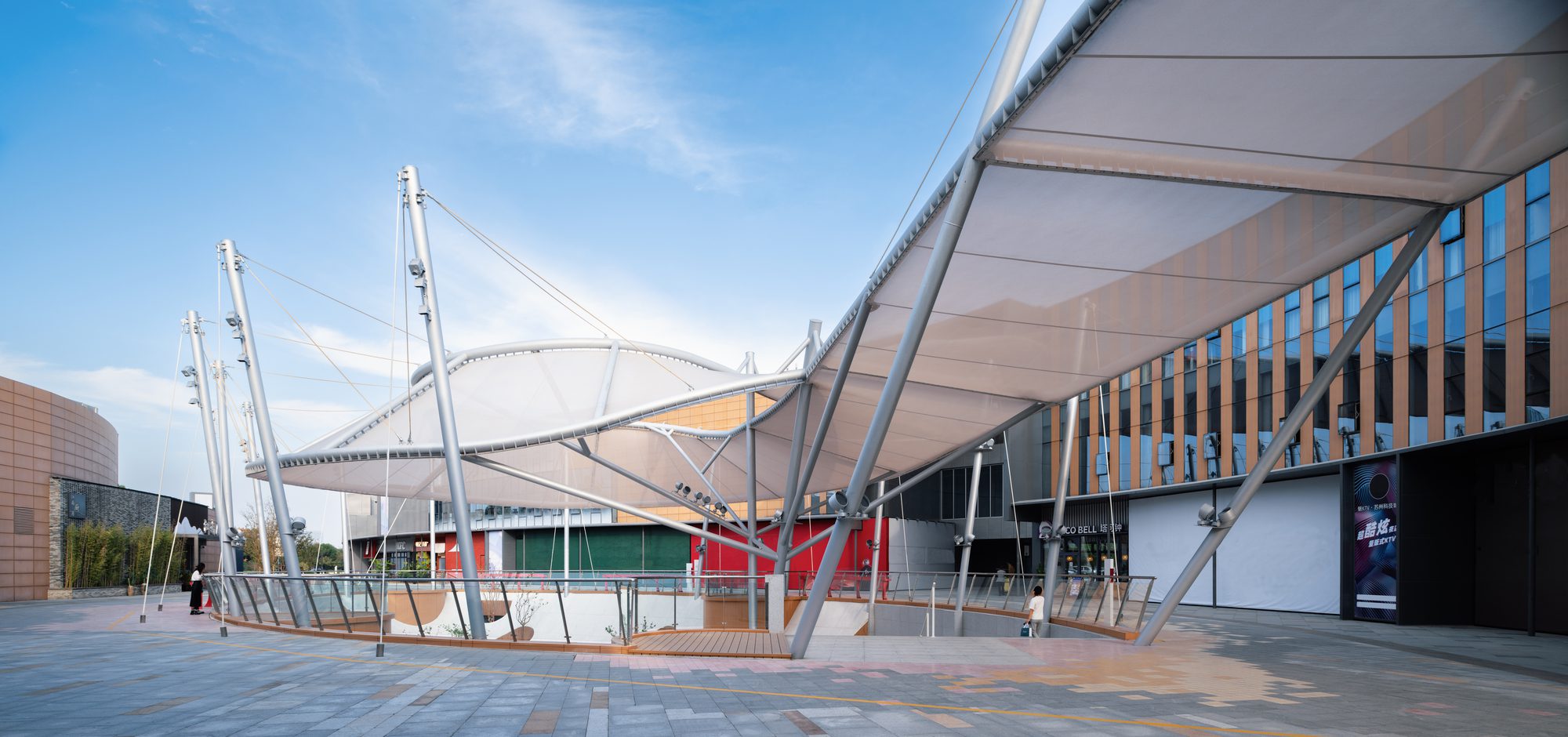 The membrane not only becomes the canopy of the plaza, creating a field of embrace and sky peek but also serves as a woven body to guide the flow and connect several outdoor main nodes. Steel columns sit on the basis extension of the original concrete columns, the membrane structure is balanced by the suspension and support together, cutting down the inevitable structures in the plaza.