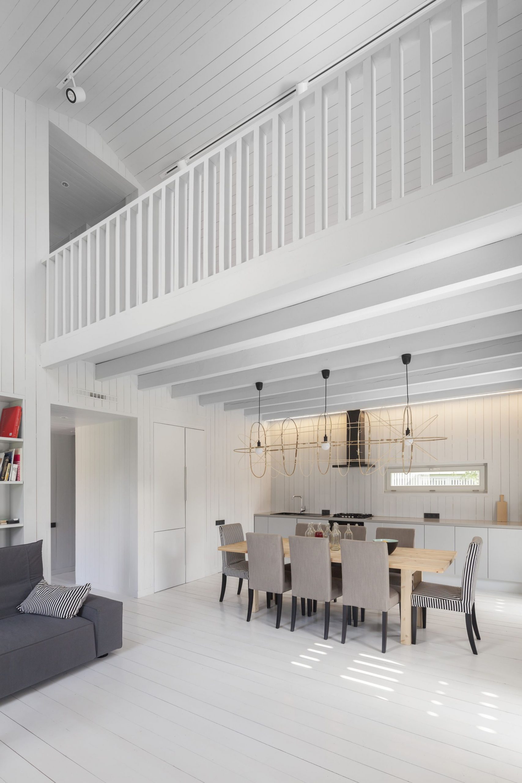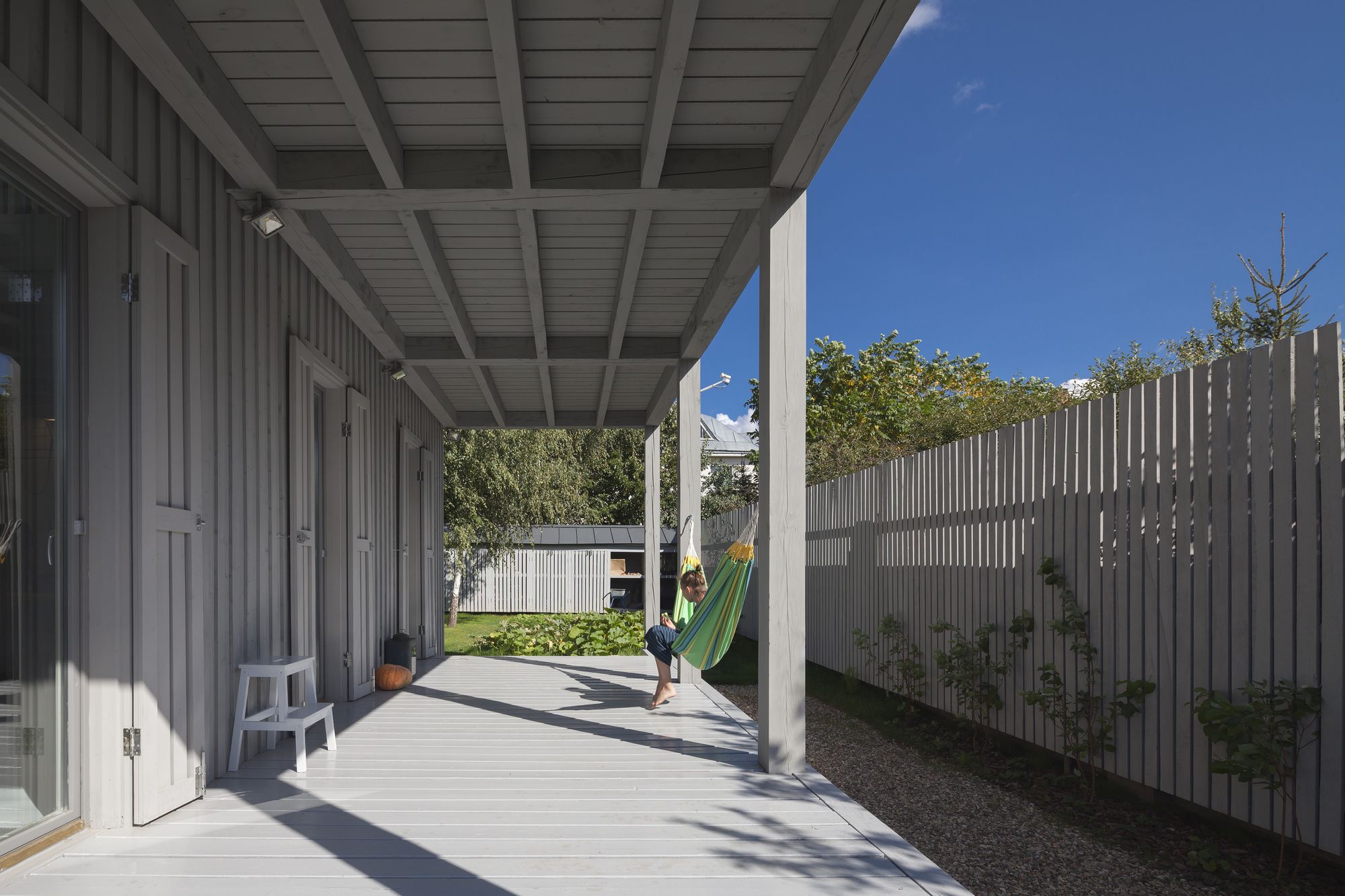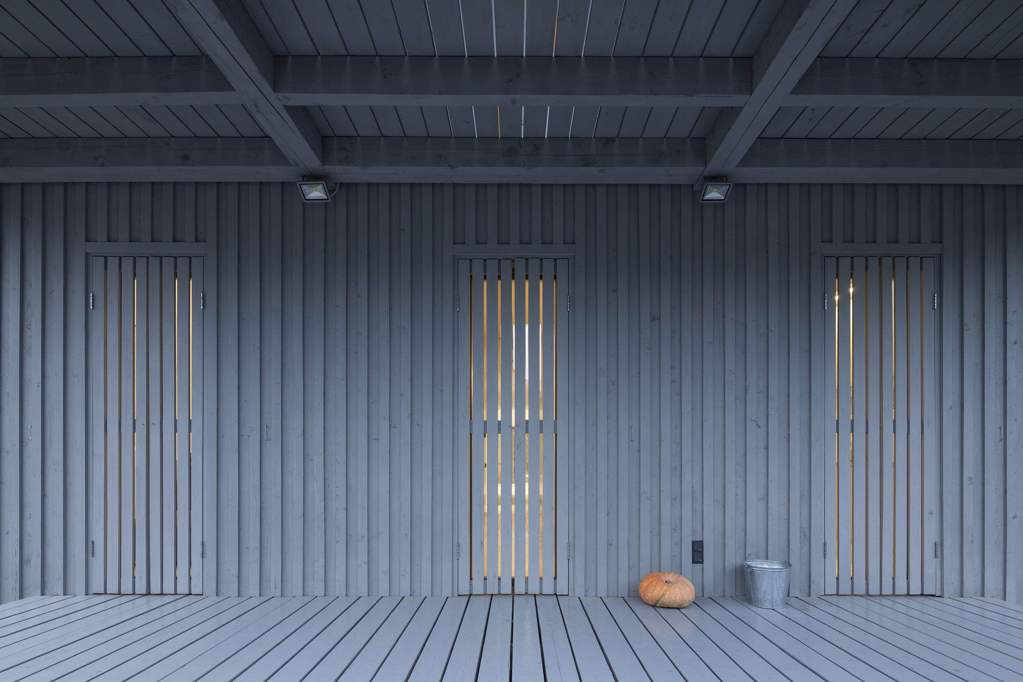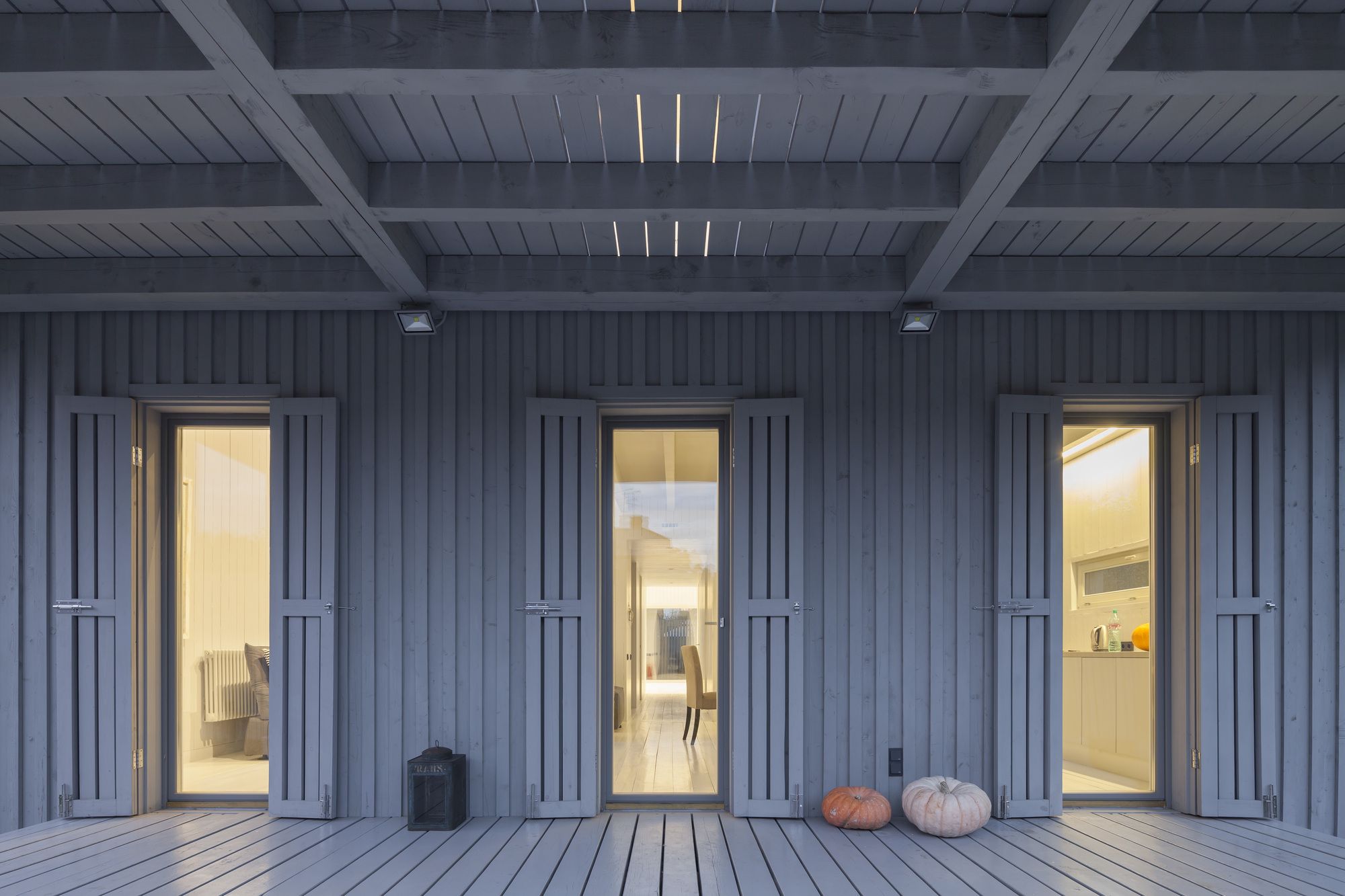 The cottage is made entirely of wood, inside and out, and the natural self-sufficiency of this material became one of the key themes of the design. The structure is also made of wood. Of course it is made from local wood, still the most affordable building material in Russia. The cottage’s layout is in the shape of an elongated rectangle, and the architect has placed it crosswise and in the middle of the rectangular plot, setback from the fence at the minimum distance dictated by standards. In this way, the ten acres are visually split into two non mutually-dependent areas: a small front garden and a yard in the back. Facing the cottage is a small guest house and a tidy tool shed camouflaged by a fence. The main house has two floors, but from the majority of perspectives this cannot be seen. This is due to the fact that almost all of the top-level areas are illuminated by skylights, while the slope of the gable roof is minimal. Under the overhang on the main facade, the completely blank wooden surfaces are visually striking upon entering the plot of land, and even more so from the street, creating a feeling of a totally introverted volume. Also magnifying this image are the shutters, which for all windows are made from the same wood as the facades, and painted in the same light gray color.