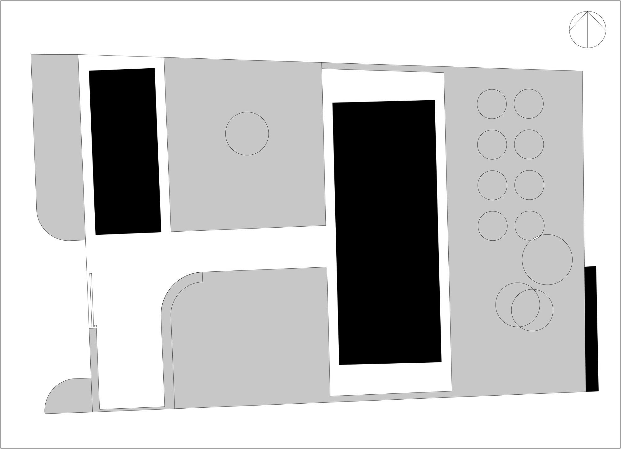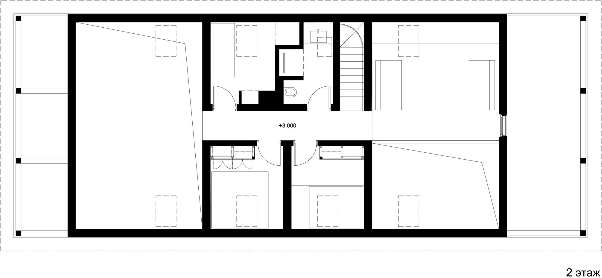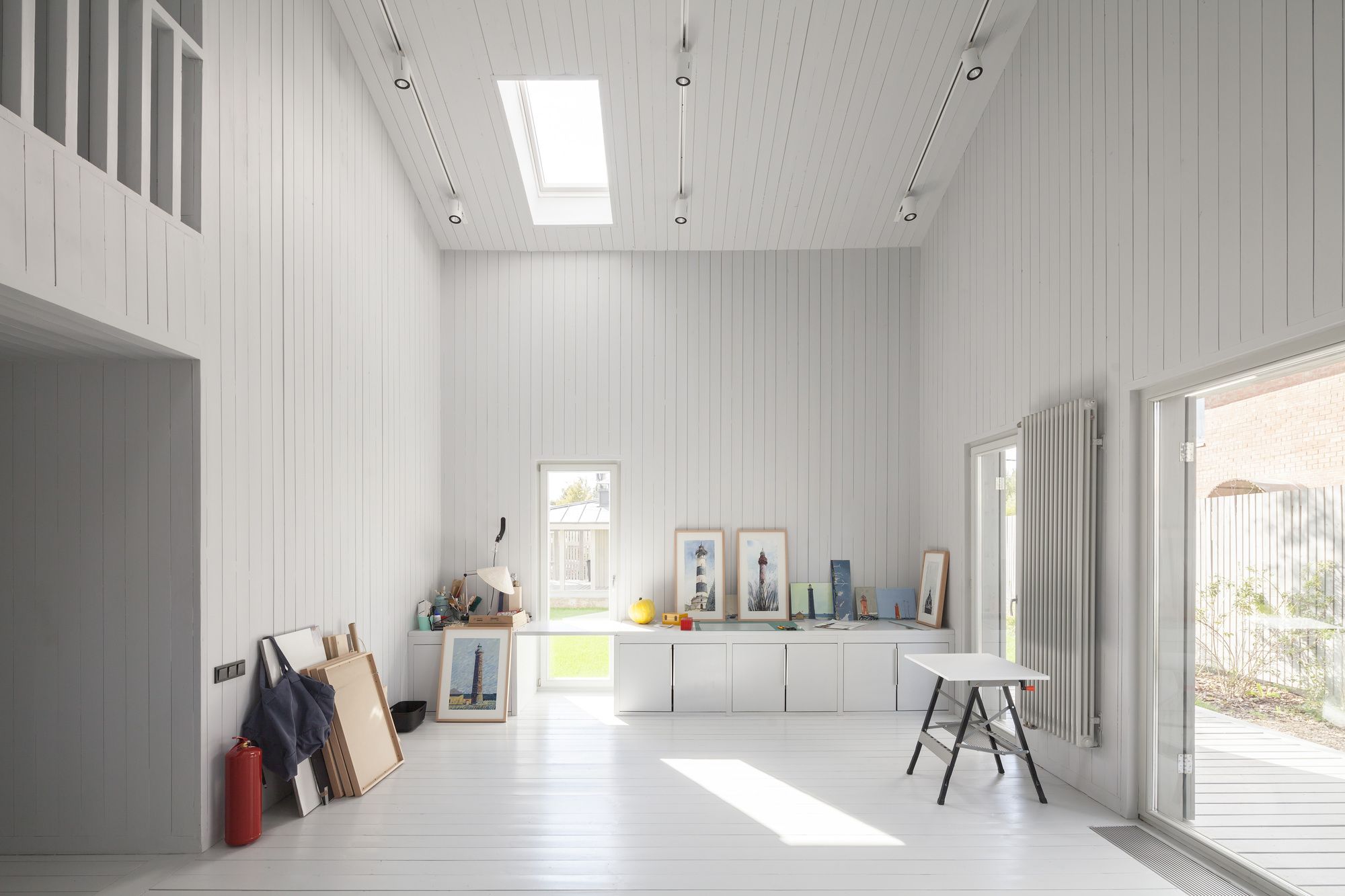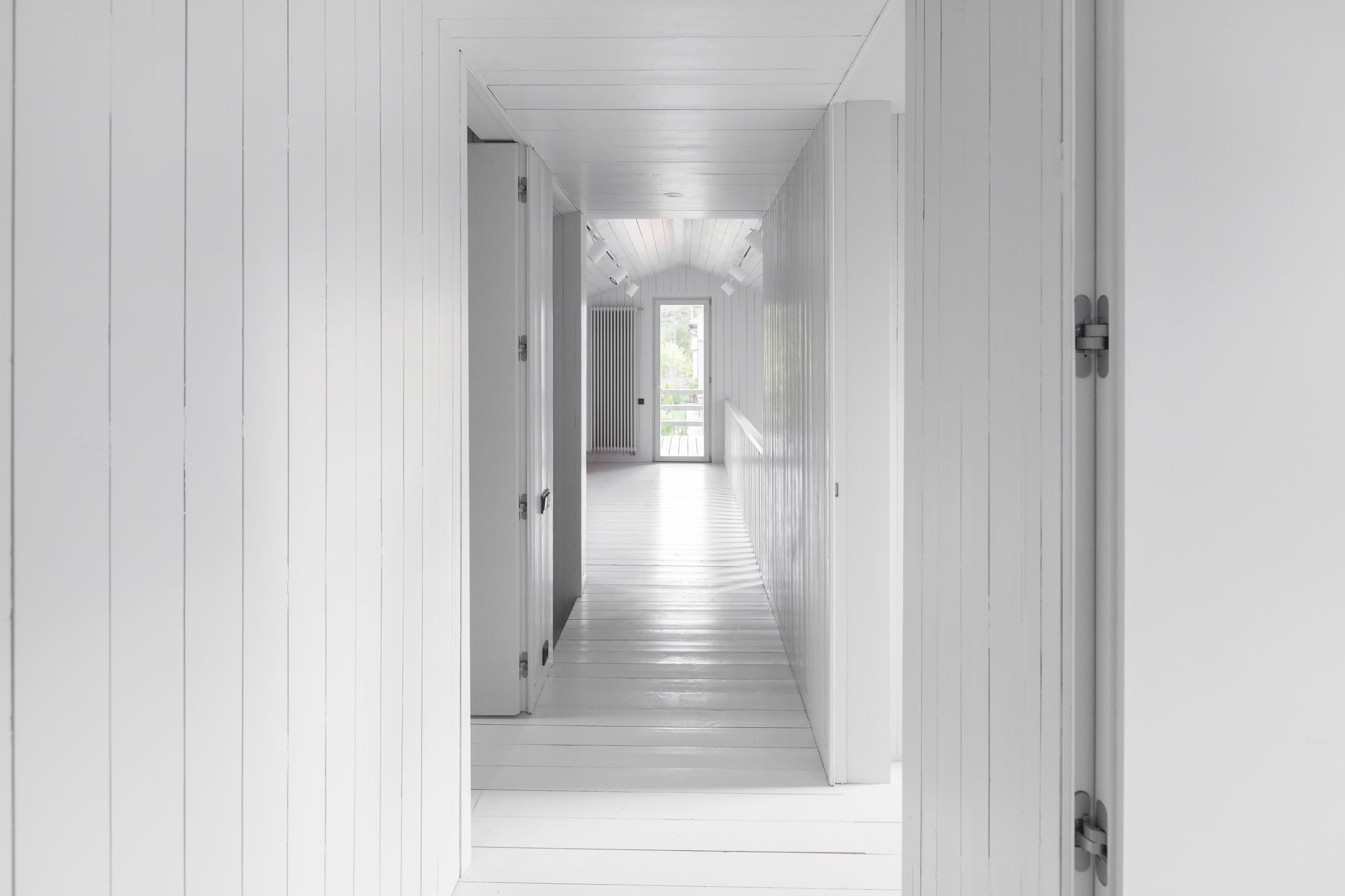 The cottage is made entirely of wood, inside and out, and the natural self-sufficiency of this material became one of the key themes of the design. The structure is also made of wood. Of course it is made from local wood, still the most affordable building material in Russia. The cottage’s layout is in the shape of an elongated rectangle, and the architect has placed it crosswise and in the middle of the rectangular plot, setback from the fence at the minimum distance dictated by standards. In this way, the ten acres are visually split into two non mutually-dependent areas: a small front garden and a yard in the back. Facing the cottage is a small guest house and a tidy tool shed camouflaged by a fence. The main house has two floors, but from the majority of perspectives this cannot be seen. This is due to the fact that almost all of the top-level areas are illuminated by skylights, while the slope of the gable roof is minimal. Under the overhang on the main facade, the completely blank wooden surfaces are visually striking upon entering the plot of land, and even more so from the street, creating a feeling of a totally introverted volume. Also magnifying this image are the shutters, which for all windows are made from the same wood as the facades, and painted in the same light gray color.