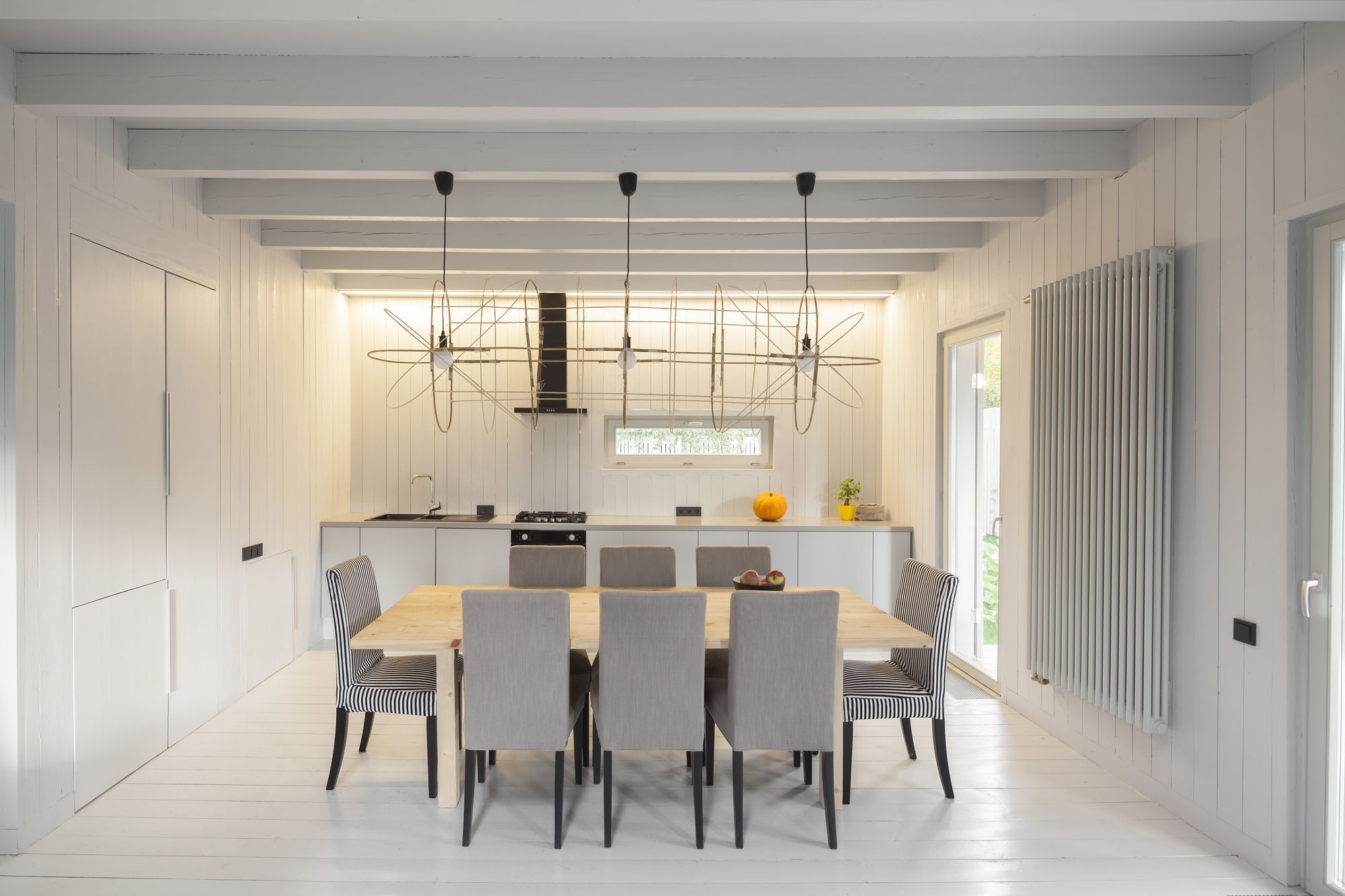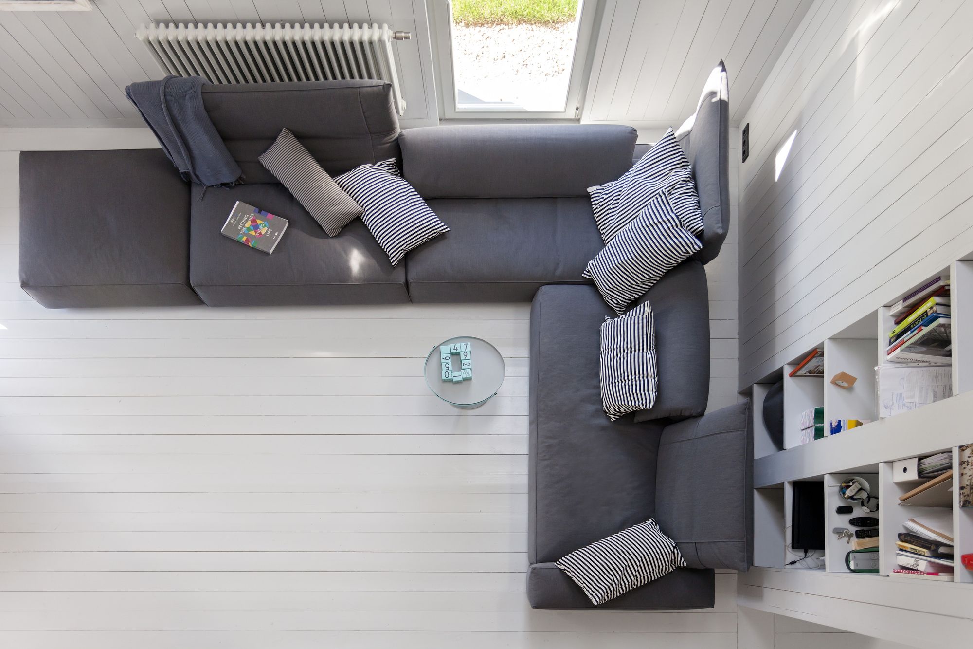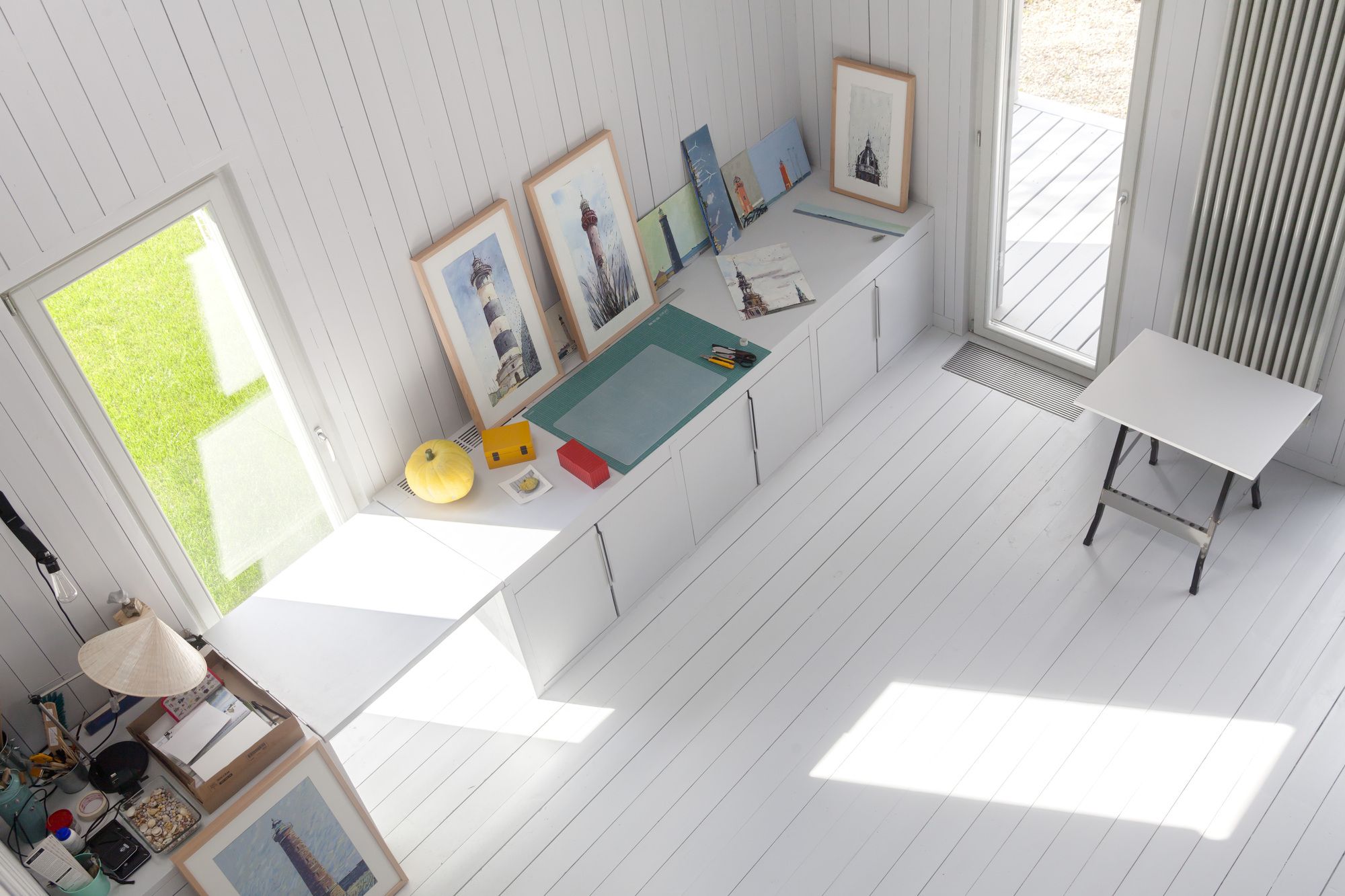 The shutters snugly close all openings. In such an enclosed form the house would have looked like a perfect parallelepiped, if not for the terraces at both its ends and the deep square niche of the main entrance (the glazed door also has shutters). The internal layout of the house is built along the intersection of two axes: placed longitudinally are the living room and studio, each facing its own terrace, and crosswise is the entrance hall and the staircase located in front of it. Directly opposite the front door there is a small window looking out into the garden: even from the street this effective viewing opening is clearly visible. The themes of a monochrome design for the facades and the openness / closeness was meticulously developed in all the interiors of his home as well. There is no cabinet furniture, only built in, serving as a visual continuation of the walls. This technique allowed for the even quite modest in size bedrooms to appear spacious, while emphasizing to the best effect the dimensions of the living room and studio. The most difficult part in the practical implementation of this design was joining the boards of the walls, floor, and ceiling without using traditional fastening corners which are deemed essential for moldings, planks and cornices of any wooden interior. In this house all such junctions have been taken care of with the use of specially-prepared angled bars. As for the interior’s palette, the finishing in all the rooms is the same gray (only a few shades lighter than the one used for the facades), working as a perfect backdrop for the rare colored accents, such as the orange couch or the yellow flowerpot.