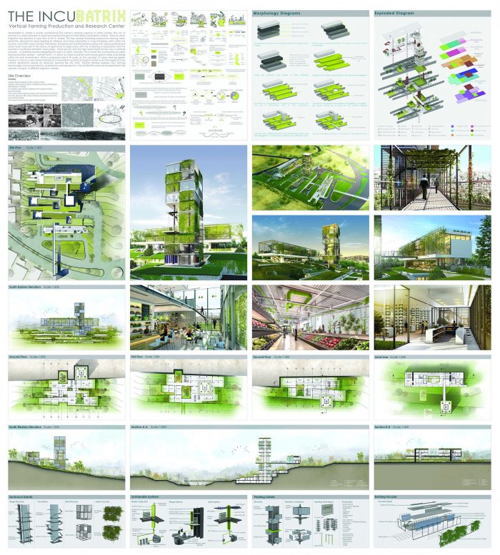 Branching from the concept that man and nature should become whole again, The Incubatrix encourages people to explore the new farming technologies by providing planting workshops, educational and research facilities, a restaurant, a market, a recycling center and of course a walk-through in the production tower to introduce the concept of hydroponics.