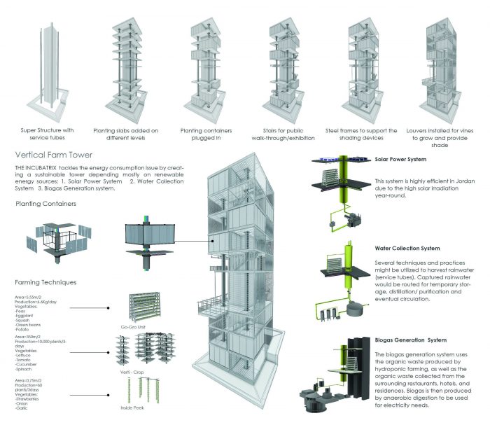 Emerging from the global trend of vertical farm towers, The Incubatrix is a vertical farming production and research center that serves as an experiment in the city of Amman – Jordan. The project idea came to our notice in light of the present crisis in the agricultural and water sectors in Jordan. This project incorporates the technology of hydroponics to produce fresh organic produce year-round in the heart of the city. It acts as a lung in dense urban centers to rejuvenate the area.