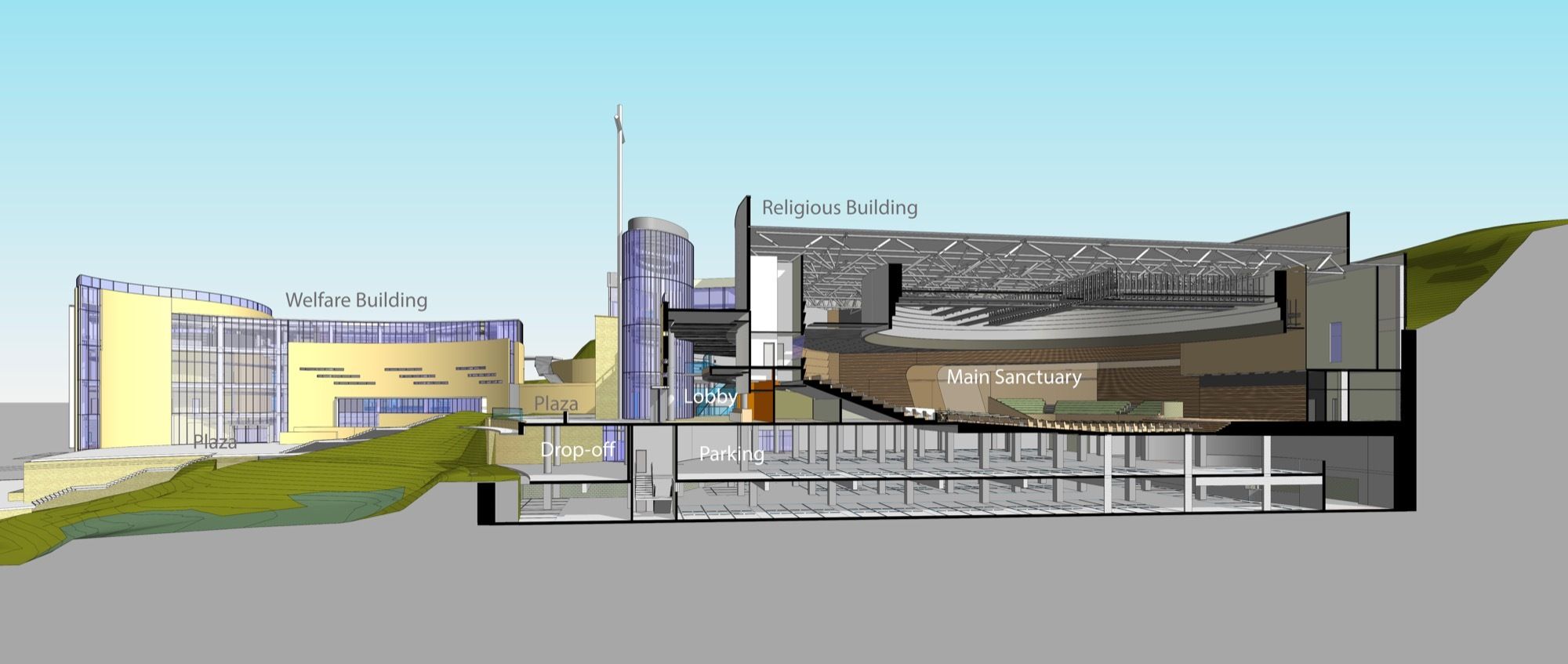 Designed by The Beck Group, Joyful Church chose Beck to create a new facility for the church’s growing, vibrant worship and education programs on Sundays and for the church’s many social welfare ministries during the week.  The church’s vision was to have a design that expressed a strong symbolic Christian message, but that also used traditional Korean symbols in a fusion of architecture, faith, and culture.  The location was a 10-acre site in a new town development area of Pohang.  This site had many development challenges included steep, wooded hillsides and strict zoning limitations.