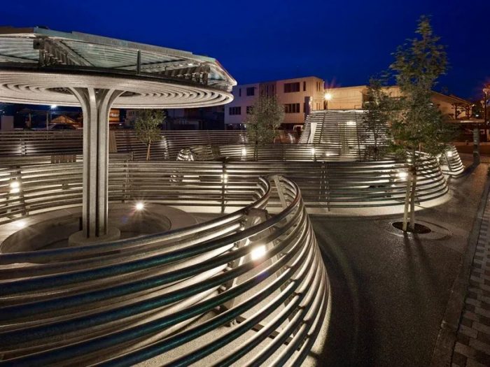 One of the most entertaining things is reading descriptions of projects and then looking at project images. You read exciting phrases such as; “a new type of square where the public is encouraged to experience the city in a totally different way” and “People experience a new activity they never got in the previous town.” But then when we look at the images we see no trace of people or their presence and interaction with the design. Nonetheless, this project, comprised of three different park spaces, is meant to engage people and provide them with new spaces to enjoy and gather in. In site A, people walk around three basins, while in site B, they walk along pipe lines. Site C is centered around a tree-like object.