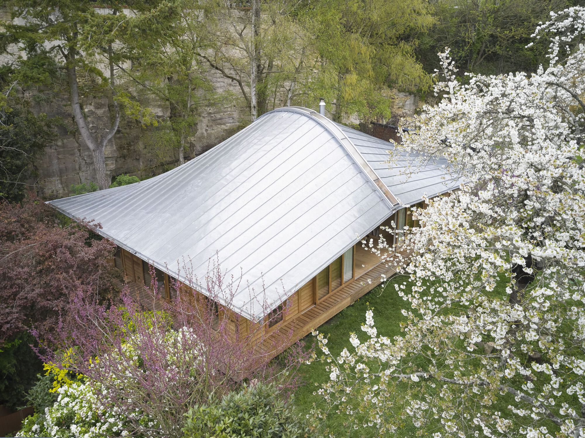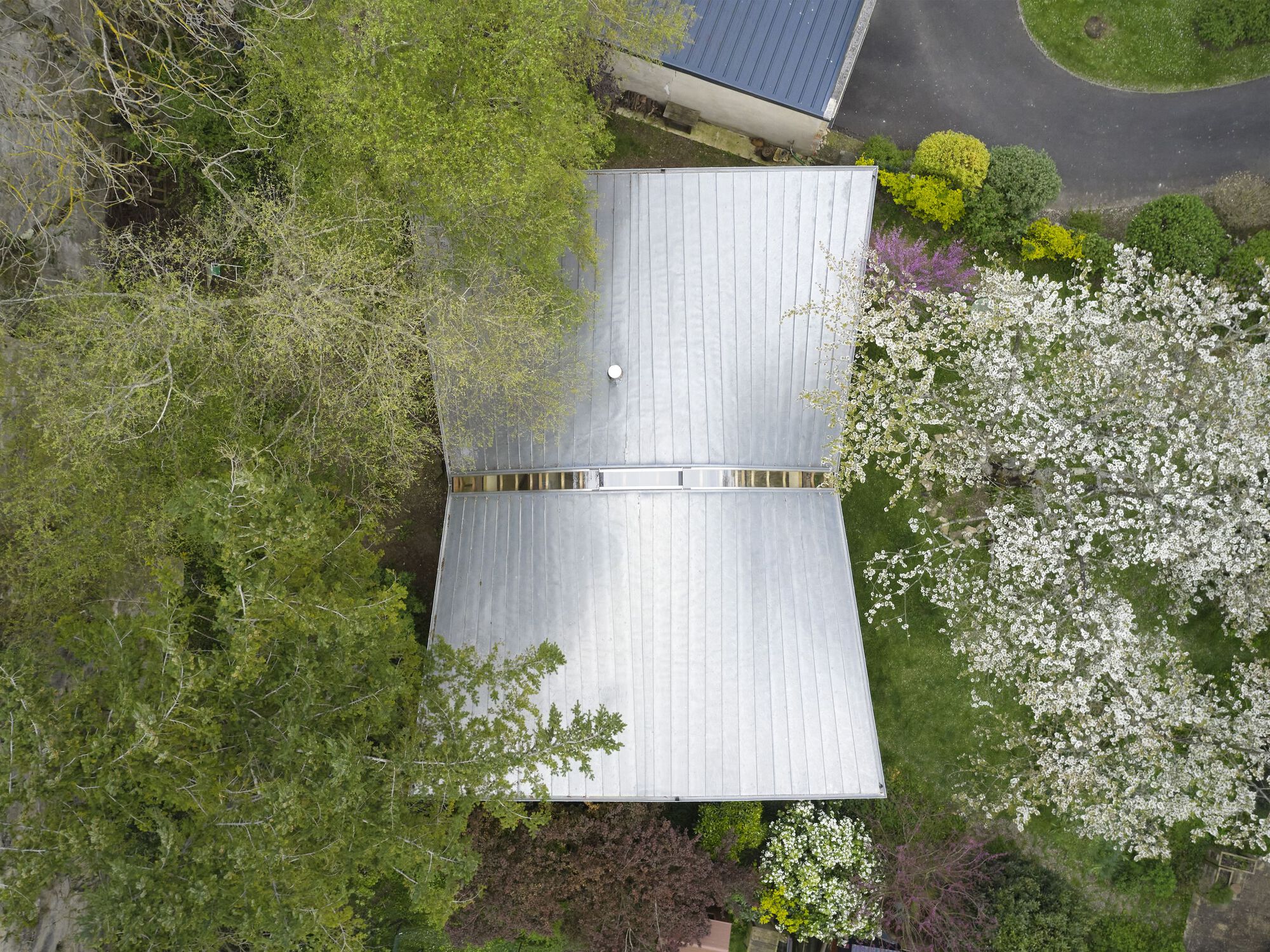 To simplify the installation of the zinc, the roof is a developable surface, i.e., resulting from the simple deformation of a plane. Each strip of zinc is twisted to follow the rise of the roof that houses the upstairs workshop.