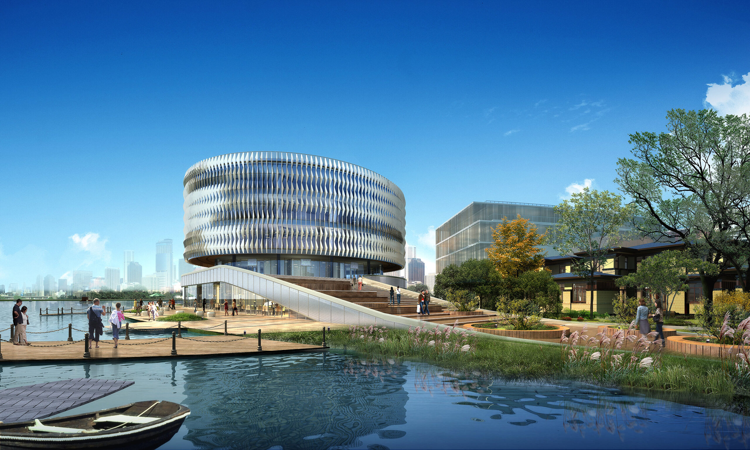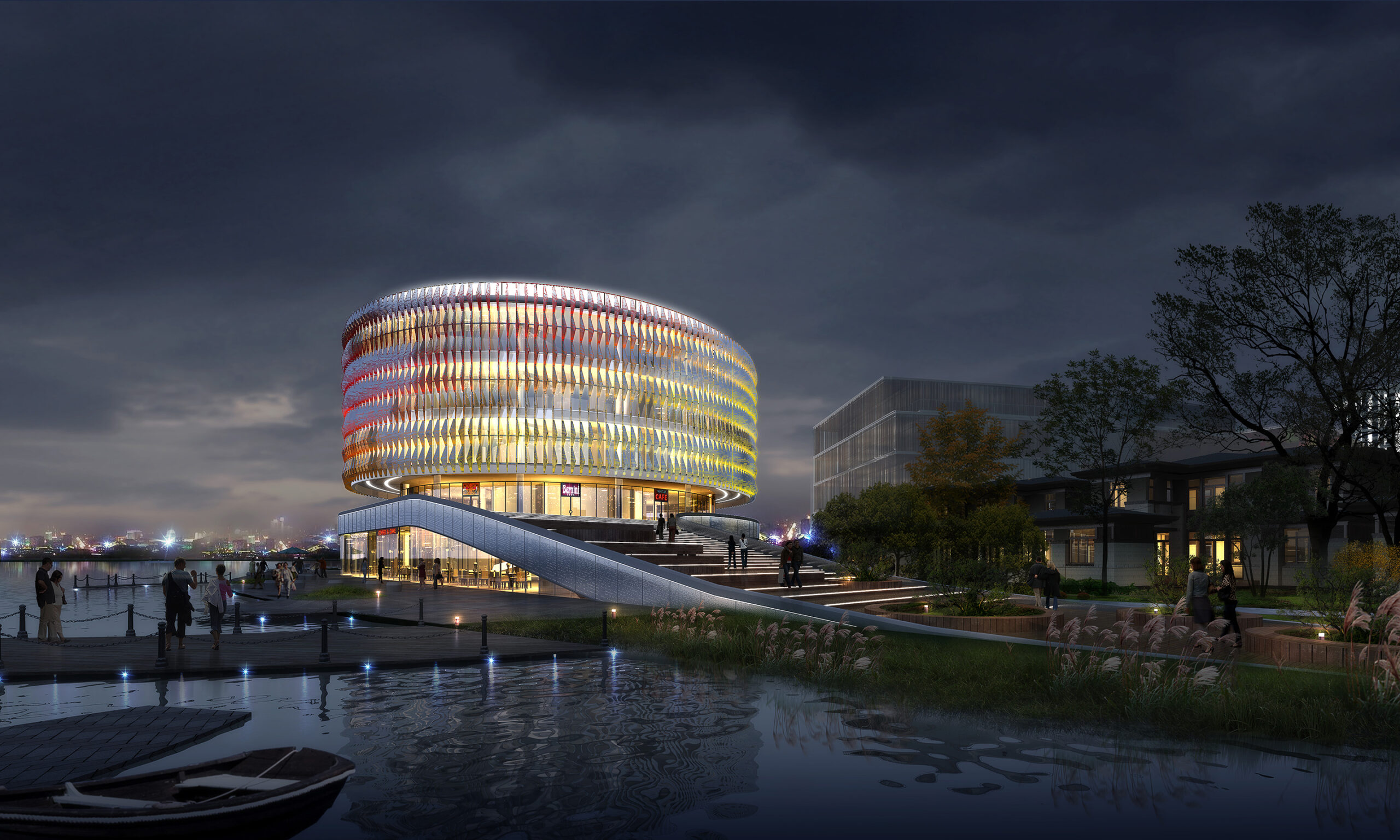 UA studio 7 present one out of 5 commercial buildings planned for the new development in southeastern Shanghai, China – this particular one is a showroom and an art gallery. Because it is positioned in the middle of an artificial lake, it resembles the idea of a lighthouse – only, in a rather contemporary style. The building is circular in shape and as it sits at the tip of the peninsula, it does make a statement of functioning as a lighthouse. Due to its oval character, it offers an almost 300 degrees of a panoramic view and creates a sort of a panoptic scene. The circular character is derived from UA studio 7’s approach towards creating and experimenting with ‘dialogues’, interactions and natural behaviours of the waterfront and its relation with the land.