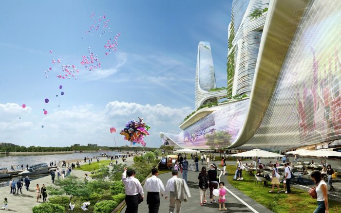 Taking up a site of 108,700 square meters, the collective towers house various functions and programs including an office tower, a hotel, service apartment, residential towers, retail podium, and a transportation hub. The towers at ground level are grouped into three pairs, each standing on a joint platform.