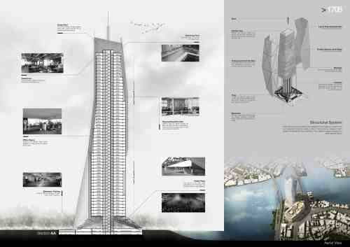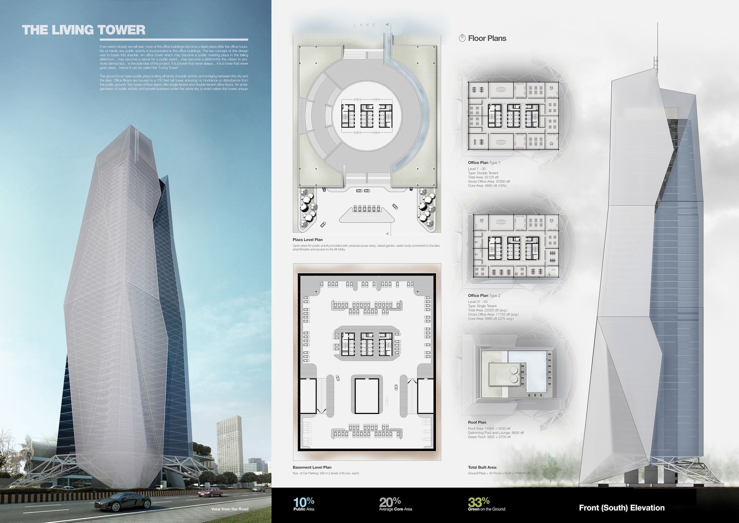 The Living Tower, If we watch closely we will see, most of the office buildings become a dead place after the office hours. No or hardly any public activity is incorporated in the office buildings. The key concept of this design was to break this shackle. An office tower which may become a public meeting place in the falling afternoon; may become a venue for a public event;  may become a platform for the citizens to promote democracy –  is the sole idea of this project. It is a tower that never sleeps;  it is a tower that never goes dead.. Hence it can be called the “Living Tower”.