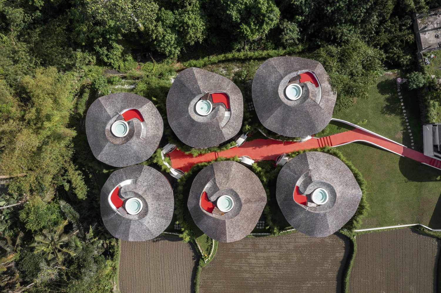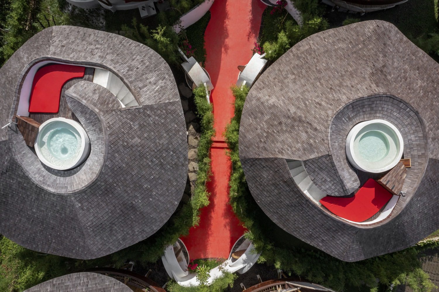 At the core of The Lovers is the concept of fertility, a theme drawn from the agricultural traditions of Bali. This idea manifests through spatial narratives that echo the harmonious relationship between humans and nature. The design minimizes the villa’s environmental footprint by utilizing only 50% of the site’s total area, leaving the remainder to showcase the surrounding natural beauty. This balance not only allows nature to play a central role in the villa experience but also amplifies the emotional connection between the guests and the environment.