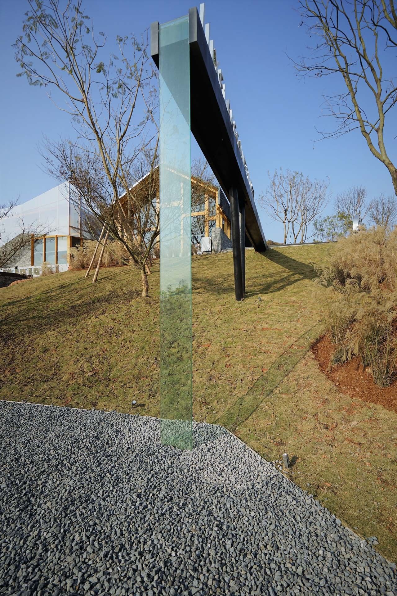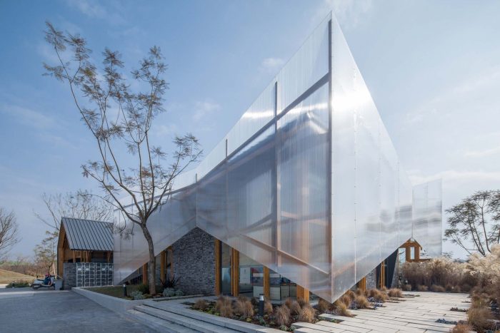 Its foyer is made of the traditional double-slope timber structure, grey bricks, and colored steel plates.
