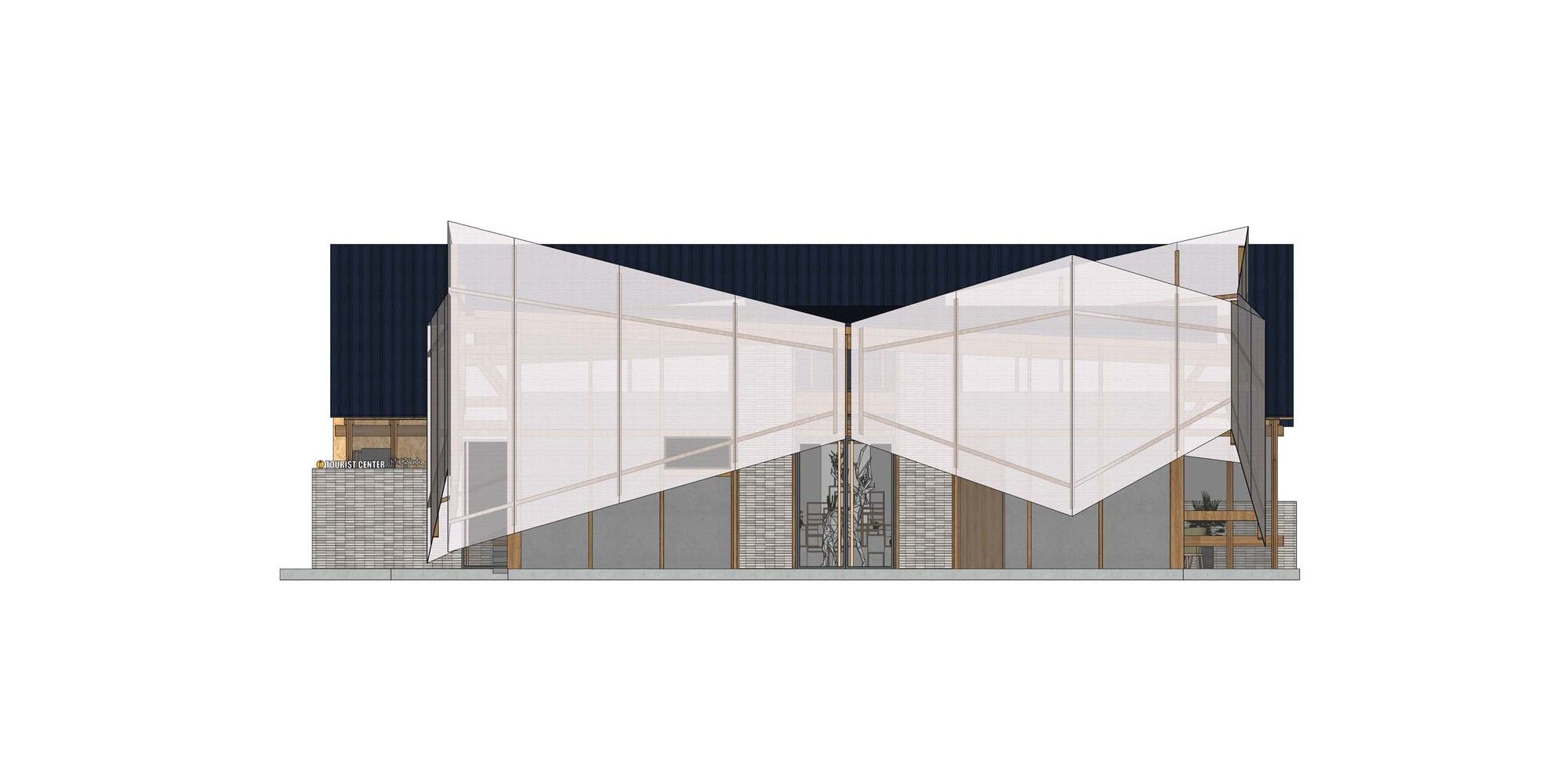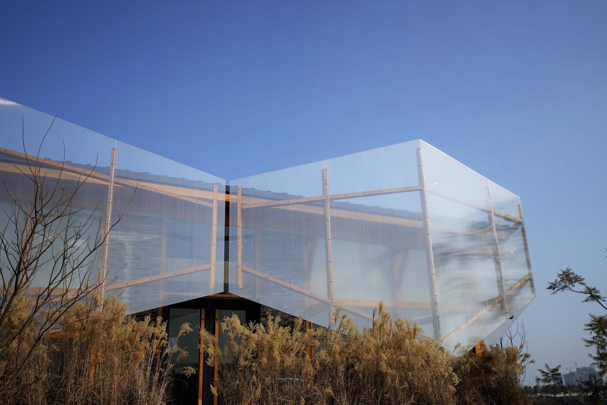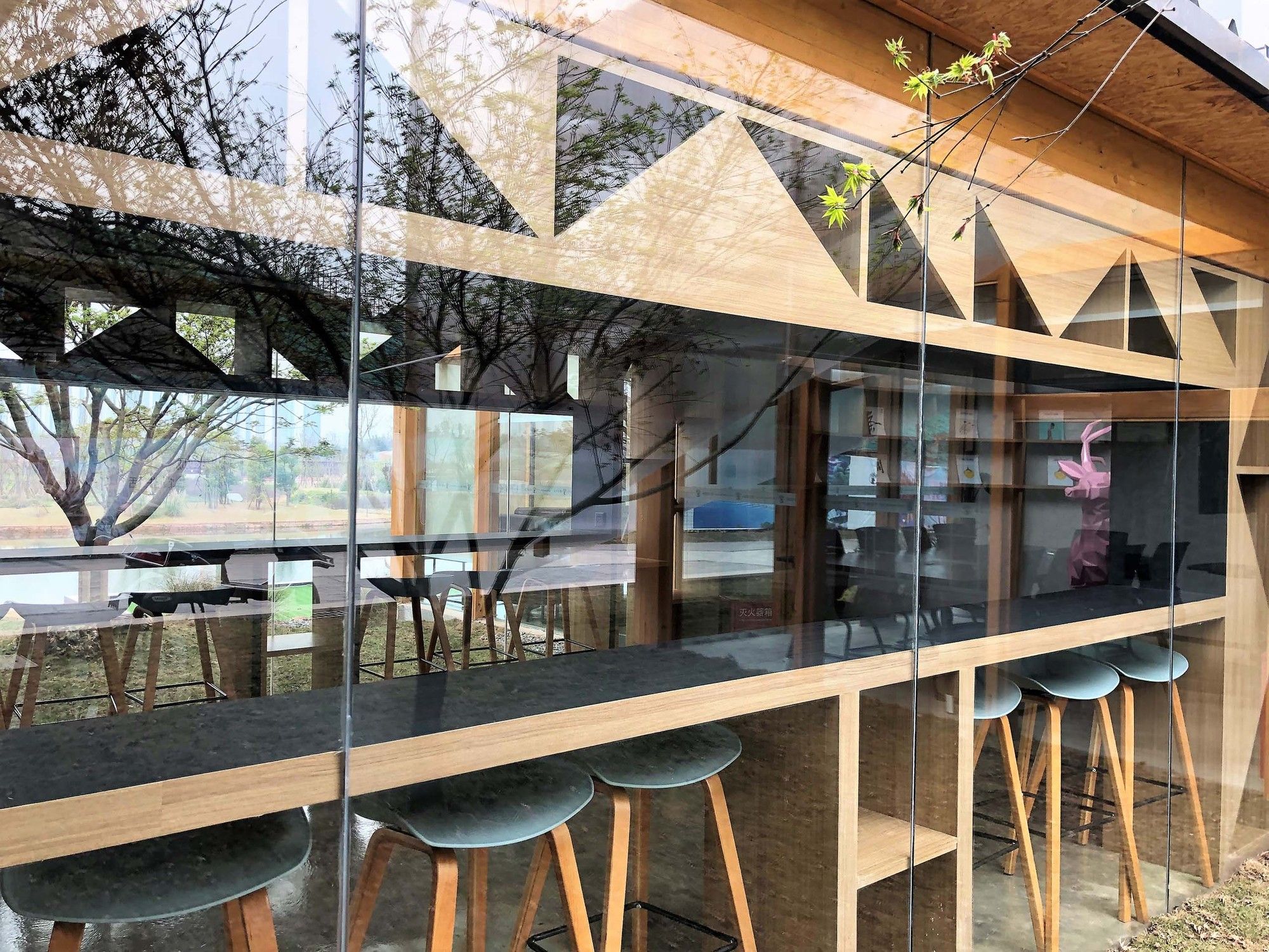 The original concept of the building was “Sailboats on the Water City”, intended to express its lightness. In order to make the building better integrate with the natural environment and shorten the construction period, plywood is used to construct its structure. The timber columns and beams are directly exposed to reduce the decoration work and present the beauty of the timber structure.