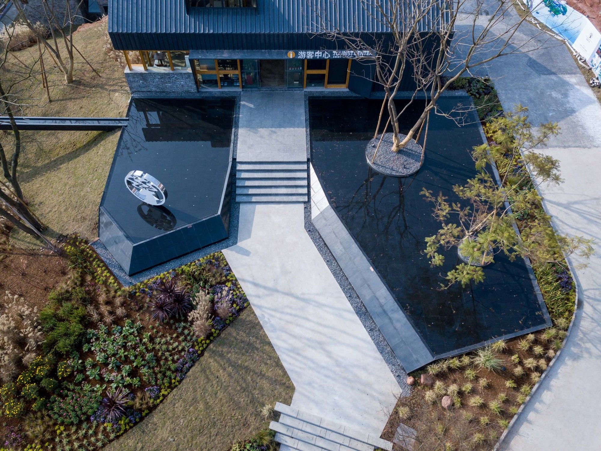 Two boutique courtyards are created at sides of the foyer through integrating the brick walls with landscaping. The waterscape at the entrance makes the building blend with the natural landscape.
