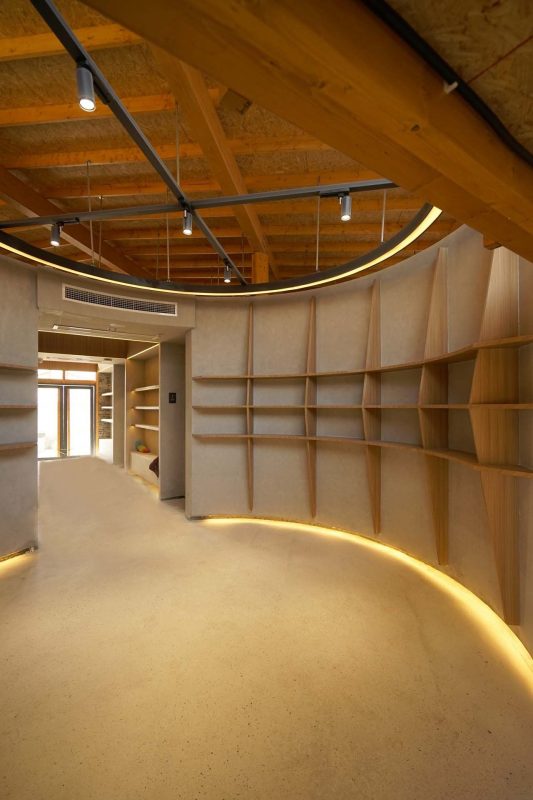 The sales corridor is lower than the foyer and displaying area, thus tourists can have a sense of openness as they entering the foyer or the displaying area from the corridor. Its interior is zero-decorated to expose the natural grain of the timber structure. All partition walls are not constructed up to the ceiling to make space be more open and free.