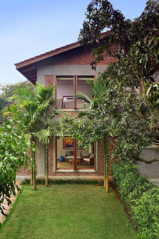 Since mango trees dominated the plot, the house clearly gets its definition from them to ensure that the basic value of being organic or adopting green culture was exercised. These 70-80-year-old inhabitants of the plot became the deciding and guiding factors for the design and concept for the house.The mango trees in the north, south and east directions demarcated the boundary of the house. The aim was to be able to view the surrounding landscape from any point within the above – along with the north-south as well as the east-west axes. This led to an entrance on all four sides for an uninterrupted view of the verdant soft scape outside.