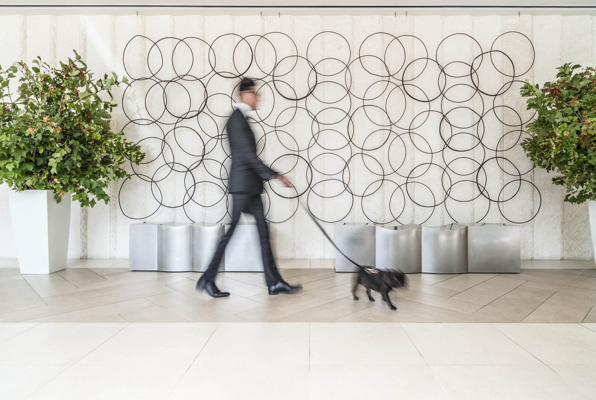 Each residential apartment is characterized by an open floor plan, energy-efficient stainless steel appliances, its own washer and dryer, and water-conserving plumbing fixtures. Living rooms and bedrooms have engineered natural wood floors. Kitchens feature sleek lacquer-finished cabinets, quartz solid-surface counters, and artist-glass backsplashes, all in a modern palette of white, beige, and black. Finishes in the bathrooms continue the sophisticated look with porcelain tile walls and floors, custom dark wood vanities, full-length medicine cabinets, Kohler fixtures, and Grohe faucets.