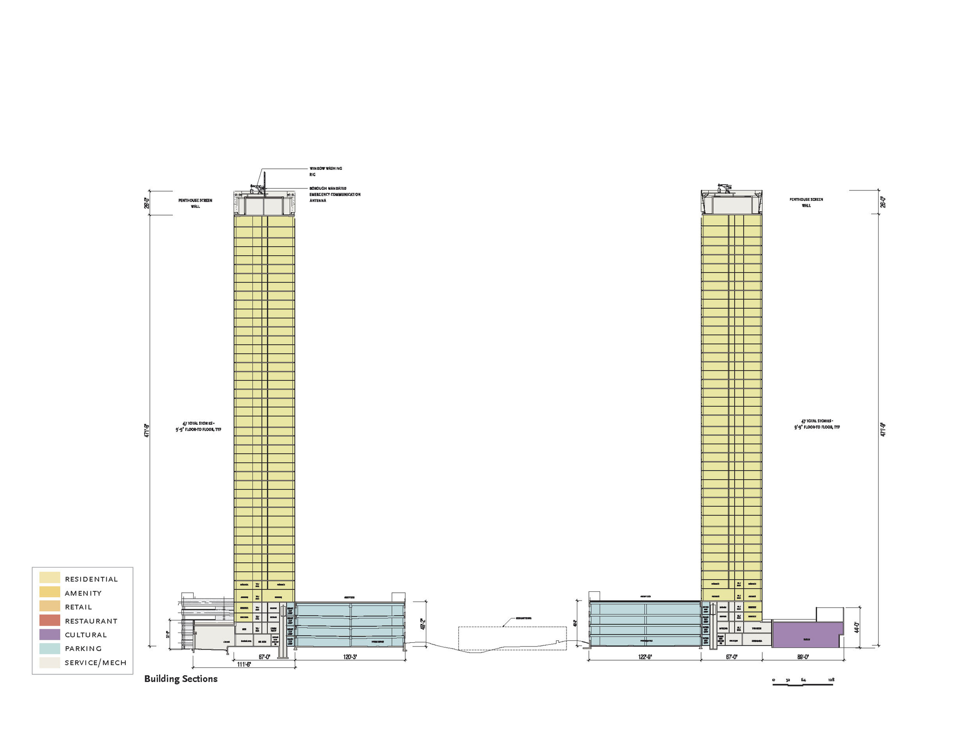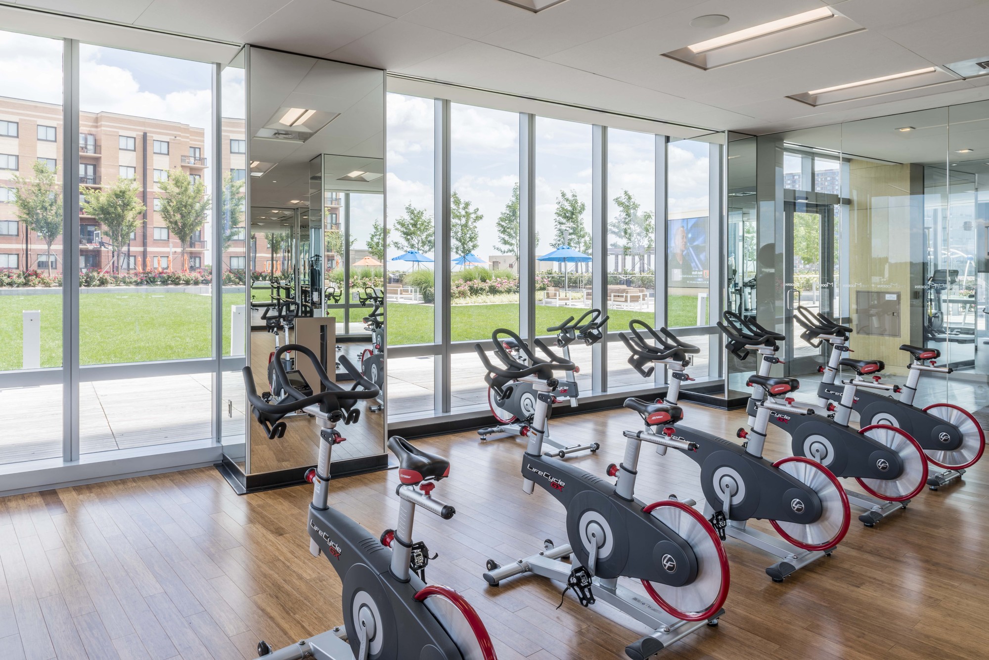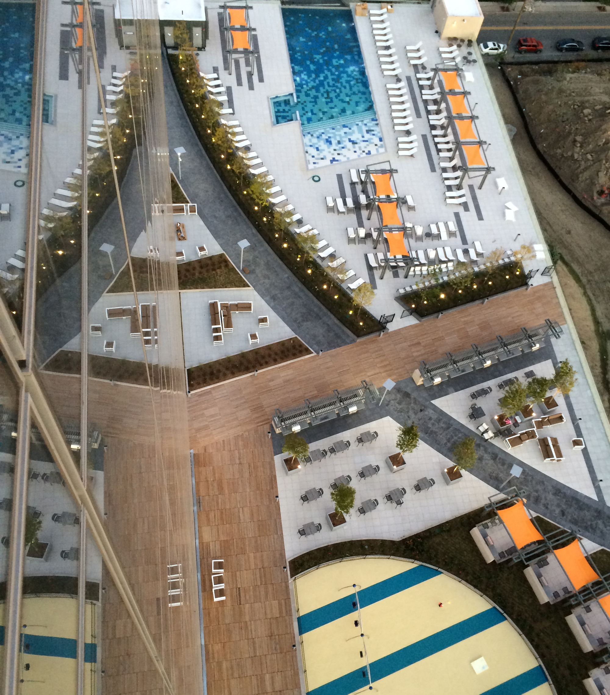 Each tower supports approximately 15,000 gsf of indoor amenities on multiple floors connected by open stairs. The variety of active and passive amenities include flexible lounge space, dining area, computer café, children’s playroom, fitness suite with yoga room, exercise room, weight training space, spa/massage room, simulated golf, screening room, bowling alley, and tween lounge. Exterior amenities exclusively for residents’ use are incorporated into extensively landscaped roof decks set on top of the parking garages and are accessible from the interior amenity spaces. The great lawn areas create gathering spaces and are equipped with Megatron movie screens and outdoor fire pits. Additional outdoor amenities include multi-sport courts, swimming pool and deck, family dining and barbeque areas separated with landscaping and walkways from individual private barbeque spaces, and outdoor game decks, and children’s play areas, which connect back to the indoor amenities.