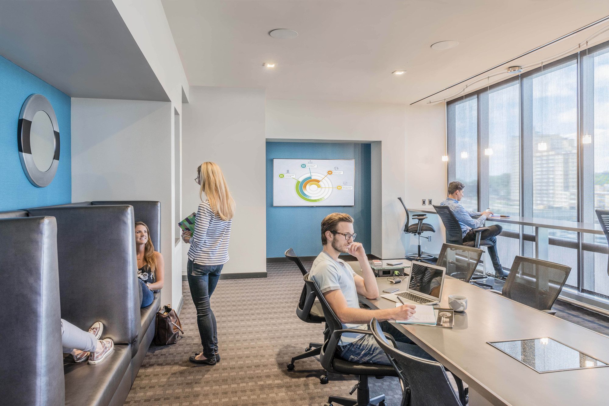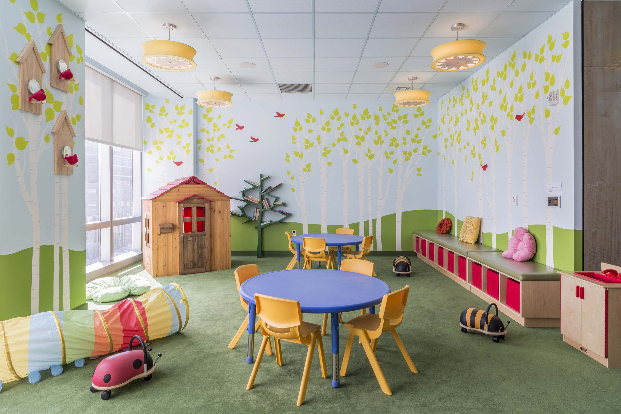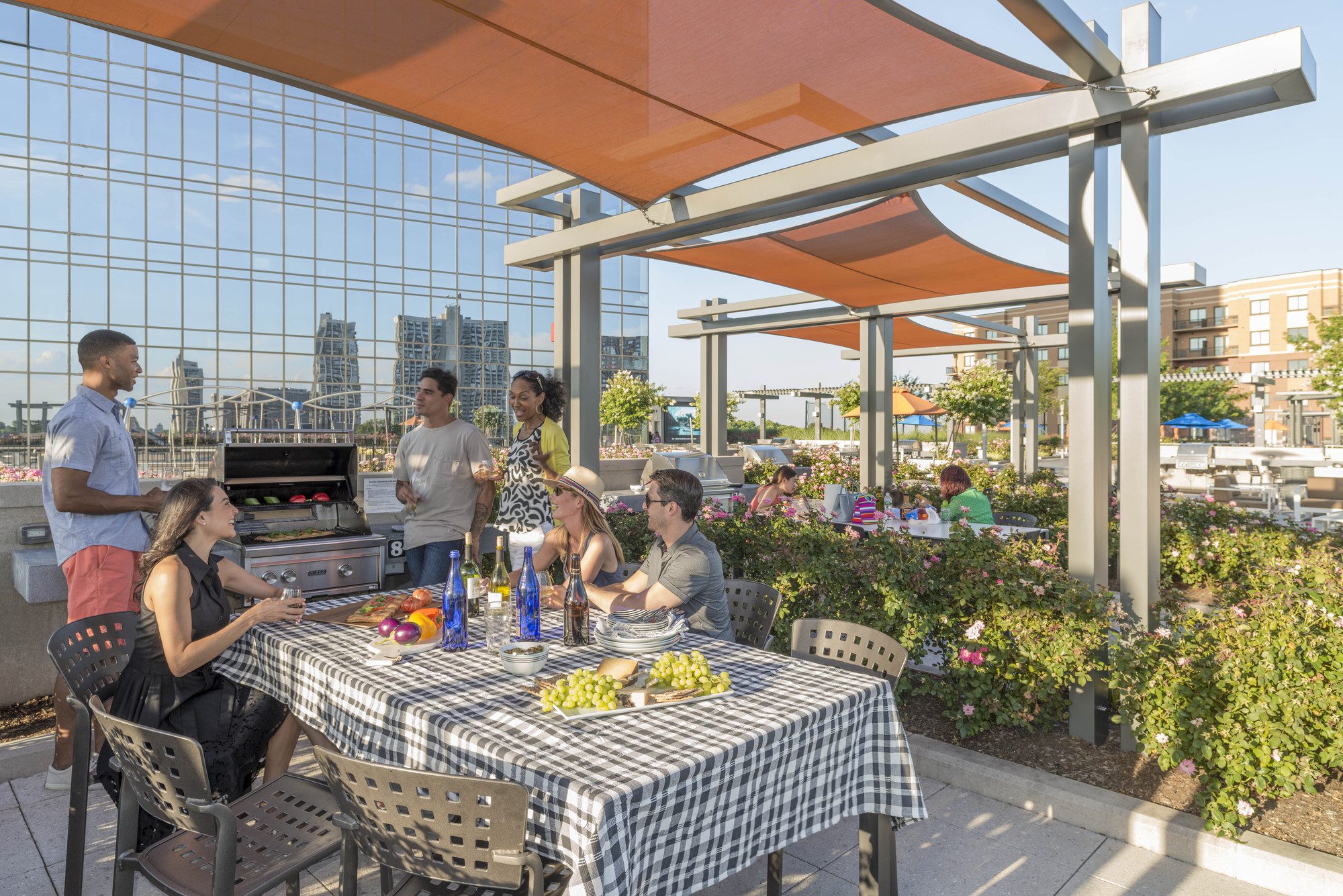 Each tower supports approximately 15,000 gsf of indoor amenities on multiple floors connected by open stairs. The variety of active and passive amenities include flexible lounge space, dining area, computer café, children’s playroom, fitness suite with yoga room, exercise room, weight training space, spa/massage room, simulated golf, screening room, bowling alley, and tween lounge. Exterior amenities exclusively for residents’ use are incorporated into extensively landscaped roof decks set on top of the parking garages and are accessible from the interior amenity spaces. The great lawn areas create gathering spaces and are equipped with Megatron movie screens and outdoor fire pits. Additional outdoor amenities include multi-sport courts, swimming pool and deck, family dining and barbeque areas separated with landscaping and walkways from individual private barbeque spaces, and outdoor game decks, and children’s play areas, which connect back to the indoor amenities.