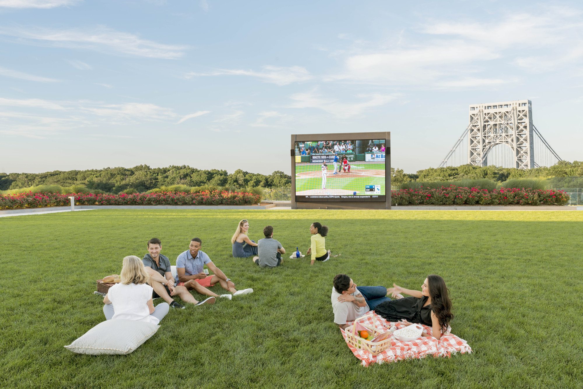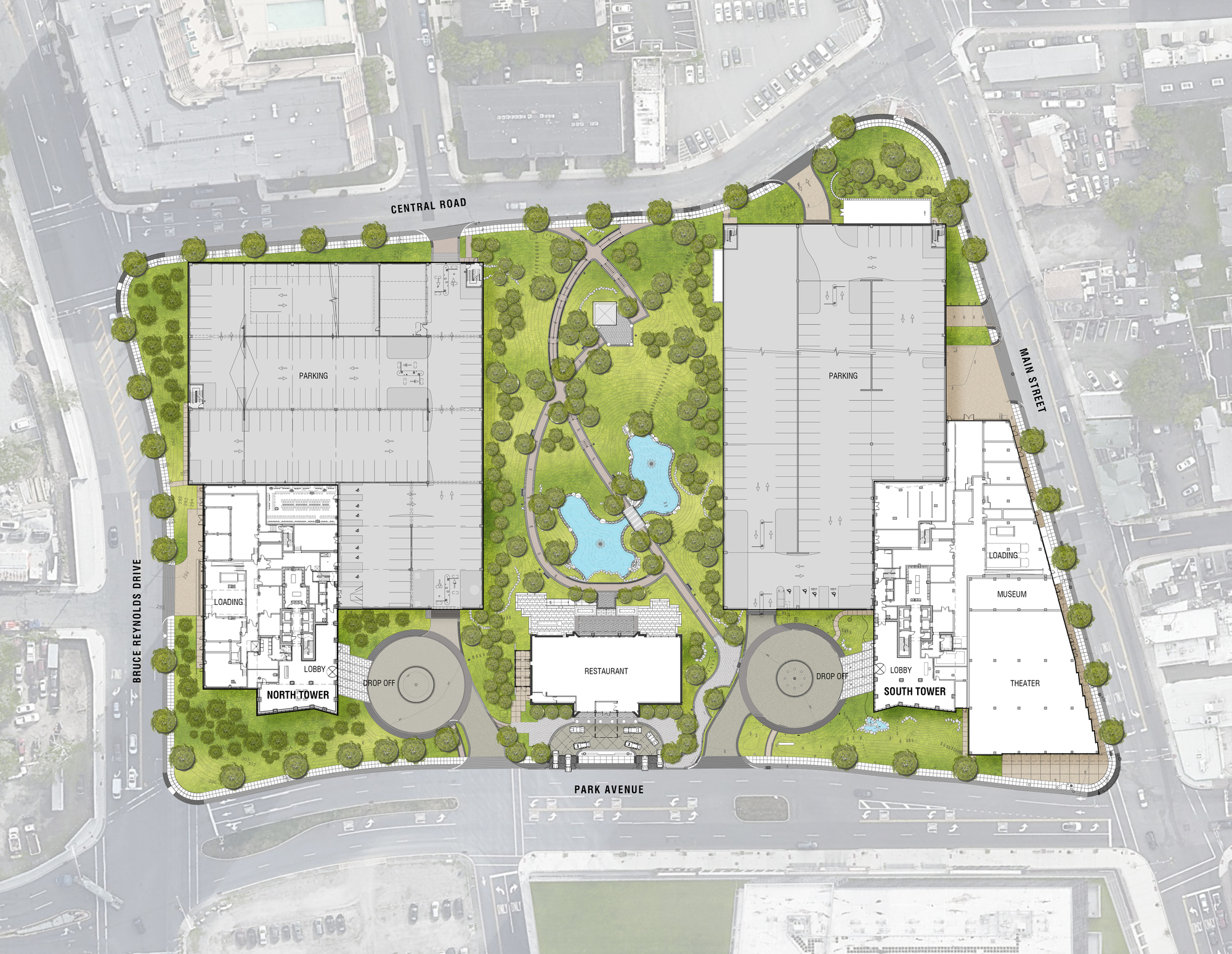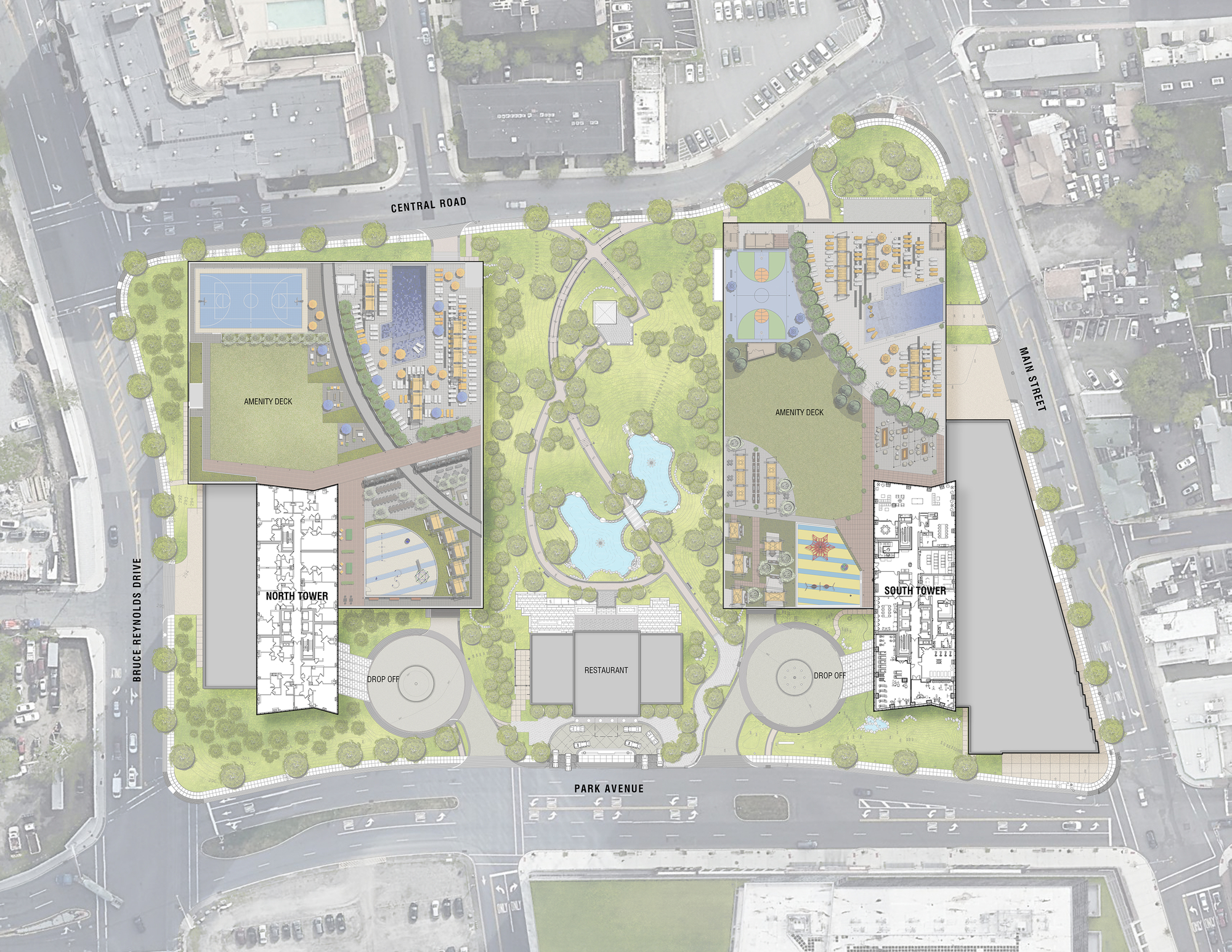 At ground level, the parking structure of each tower is buffered by the lush park plantings of the Central Green, a 1.75-acre park located between the two towers. The roof of each parking structure is a landscaped deck overlooking Central Green. Providing a park landscape for all of Fort Lee to enjoy, the Central Green features a central pond, rain garden, and pedestrian walkways. A signature restaurant with an outdoor dining terrace is an architectural focal point and destination on the Central Green at Park Avenue.