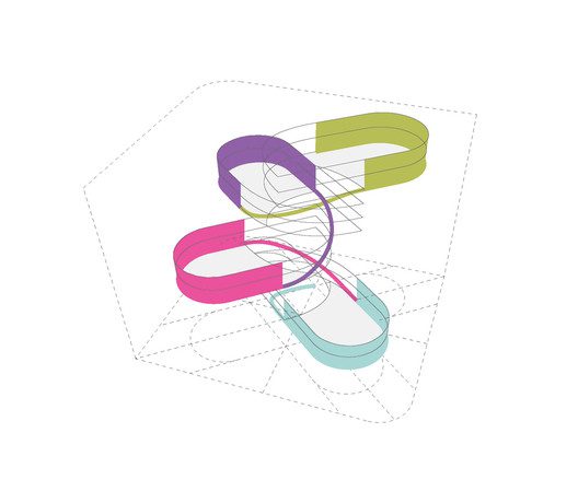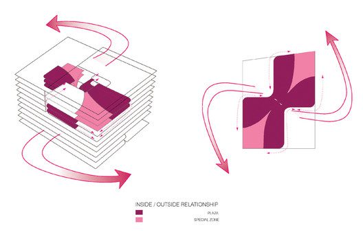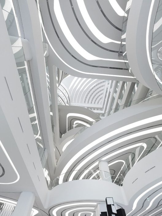 As much as the exterior is given a distinctive character, so is the inside designed uniquely and features outstanding interior architecture elements such as: oval-shaped levels supported by long columns. There are basic architectural features present – e.g. rhythm in the repetition of curves; balance and structural tension. There is also a crisscross rotational symmetry in the composition of the plateaus. The link between the 4 sets of plateaus is the large void in the middle.