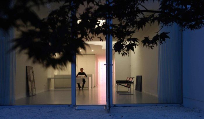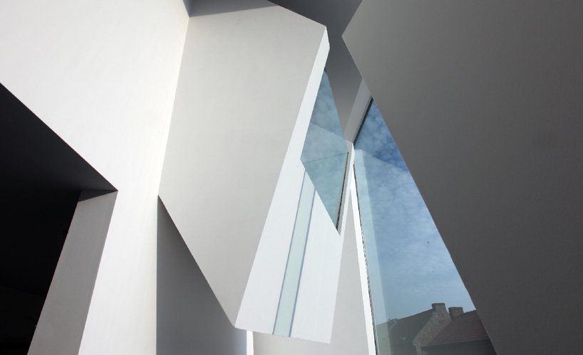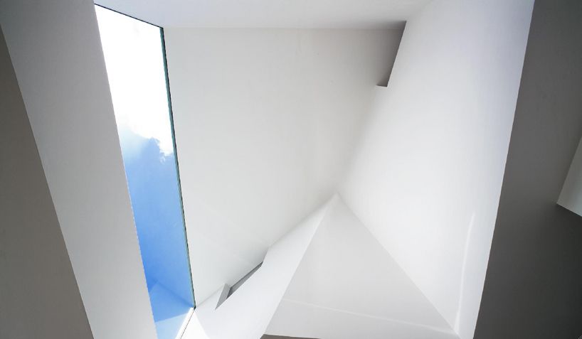 The project’s ground floor pure white facade has only two openings for the entrance and the garage. The other two floors rest on this white box and are in contrast completely transparent. The façade in the form of a display window reveals two balconies in skewed positions projected from the white façade in the background. The glass frame contains cubist like playful volumes lit with different colours during the night bringing alive this three dimensional painting. The lower balcony accommodates a reading corner for the library providing a sheltered view of the street while the upper balcony accommodates an artist’s studio. Blue light turns the façade into a spectacular light sculpture after dark.