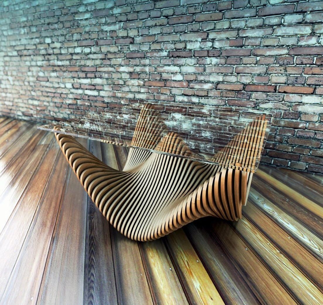 The impressive design of the wavy shaped wooden coffee tables reflects the benefits of this methodology and illustrates the imagination and creativity of the designer. The table has two prevailing characteristics: the twisted plane and the laminated configuration.