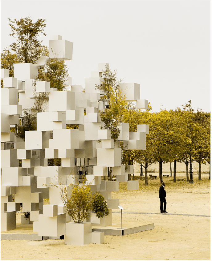 The Parisian Green Cubic Installation, the Japanese architect Sou Fojimoto has designed and installed in Paris Jardins a magnificent assembly of aluminum cubes for the FIAC art exhibition. The Parisian Green Cubic Installation features stacked boxes of different sizes connected to each other either by one edge or one corner. The aluminum cubes are planted either by plants or small trees and they together form a structure that have random openings on the Tuileries Park. The floating masses of these cubes create a new experience of space, a rhythm of flickering shadows and lights, as being under the trees.