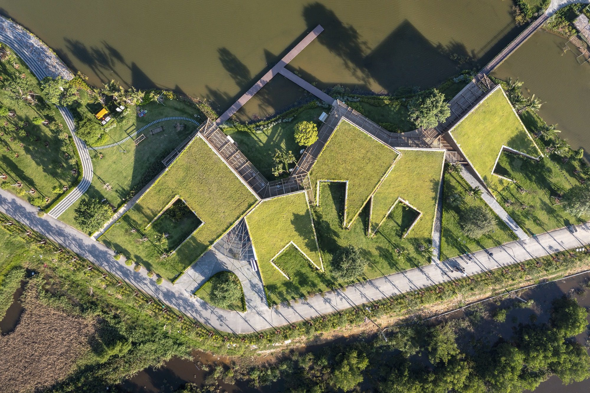 The architectural façade of The Park is meticulously designed, with a focus on intricate detailing. These carved openings serve as prominent features enhancing the building’s aesthetics and as lantern-like structures that, when combined with the shimmering reflection on the lake’s surface, create a captivating night. This method addresses the issue of nighttime illumination and significantly reduces solar glare during daylight hours, with up to two-thirds of sunlight being mitigated.